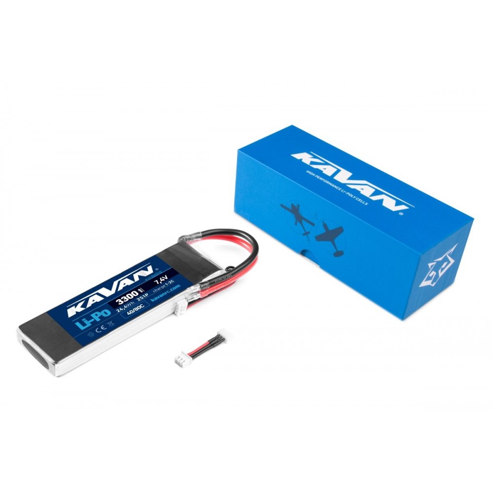 LiPo akumulátorová sada KAVAN se zvýšenou zatížitelností 40/80C, nabíjení až 2C. Dvoučlánek 2s1p 7,4V 3300 mAh, rozměry: 136x42,5x15mm, hmotnost: 167g, servisní konektor JST-XH.