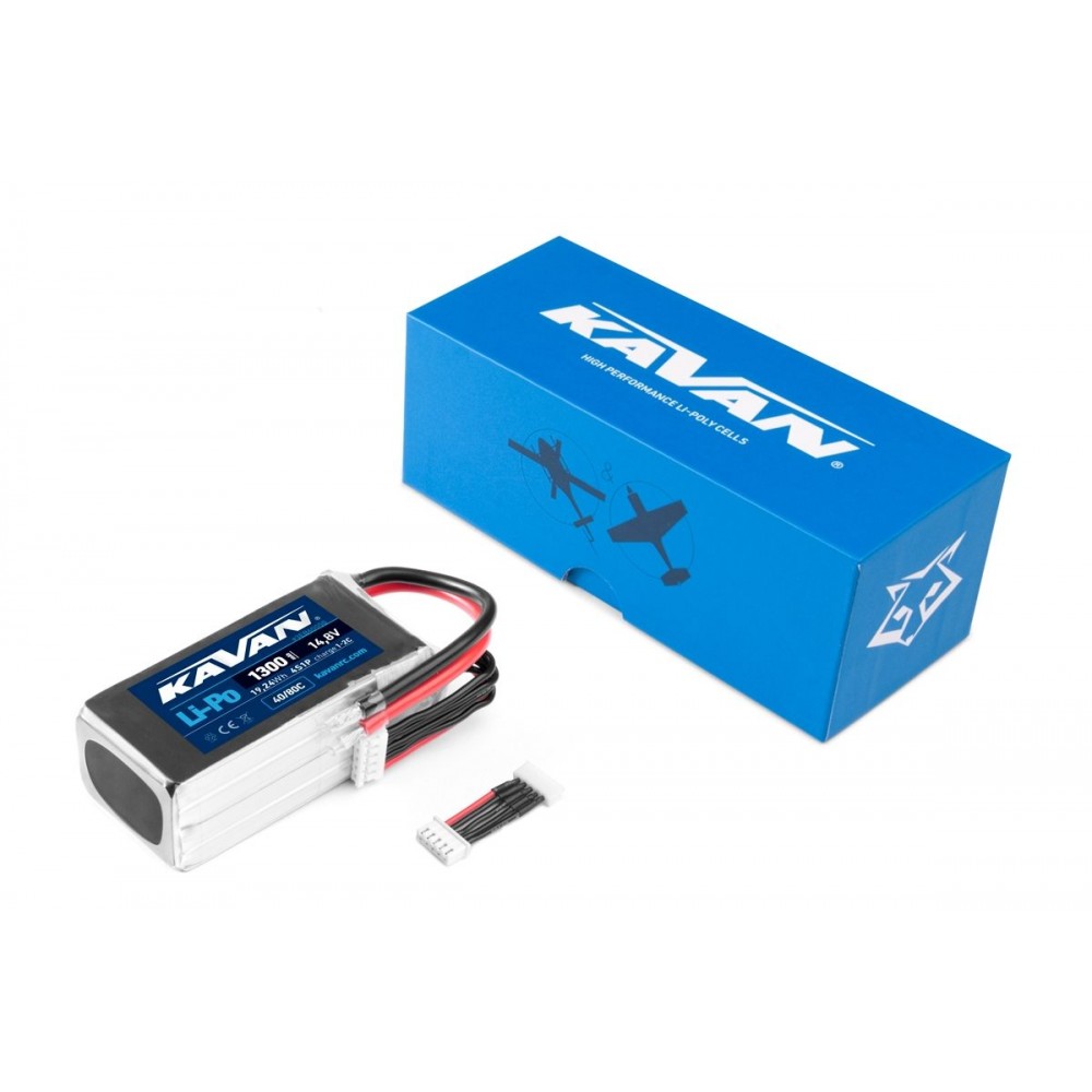 LiPo akumulátorová sada KAVAN se zvýšenou zatížitelností 40/80C, nabíjení až 2C. Čtyřčlánek 4s1p 14,8V 1300 mAh, rozměry: 72x35,5x26mm, hmotnost: 135g, servisní konektor JST-XH.