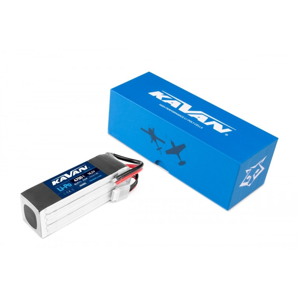LiPo akumulátorová sada KAVAN se zvýšenou zatížitelností 40/80C, nabíjení až 2C. Pěičlánek 5s1p 18,5V 4700 mAh, rozměry: 140x43x45mm, hmotnost: 545g, servisní konektor JST-XH.