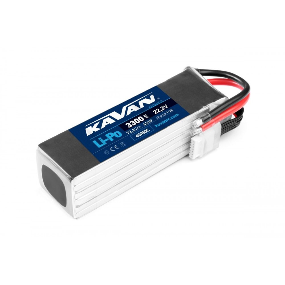LiPo akumulátorová sada KAVAN se zvýšenou zatížitelností 40/80C, nabíjení až 2C. Šestičlánek 6s1p 22,2V 3300 mAh, rozměry: 138x43x41,5mm, hmotnost: 439g, servisní konektor JST-XH.