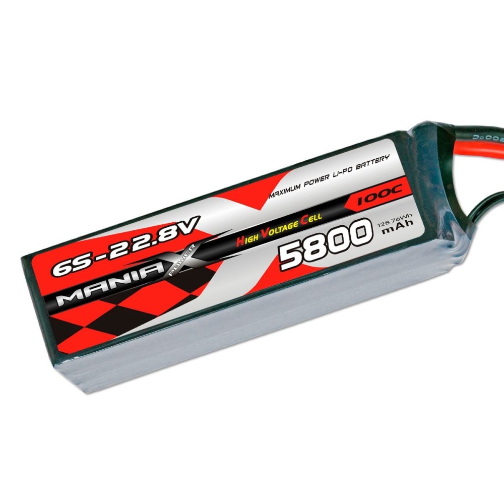 LiHV akumulátorová sada ManiaX se zatížitelností 100/200C, nabíjení 1-3C, max. 5C. Šestičlánek 6S 22,8V 5800 mAh, rozměry: 155x48x50, hmotnost: 810g, servisní konektor JST-XH.