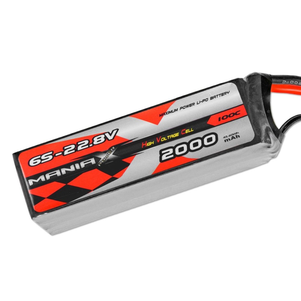 LiHV akumulátorová sada ManiaX se zatížitelností 100/200C, nabíjení 1-3C, max. 5C. Šestičlánek 6S 22,8V 2000 mAh, rozměry: 106x34x42, hmotnost: 310g, XT60 + servisní konektor JST-XH.