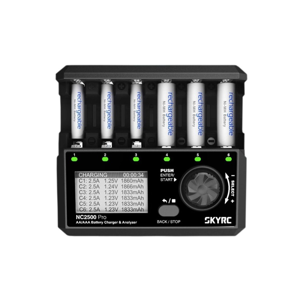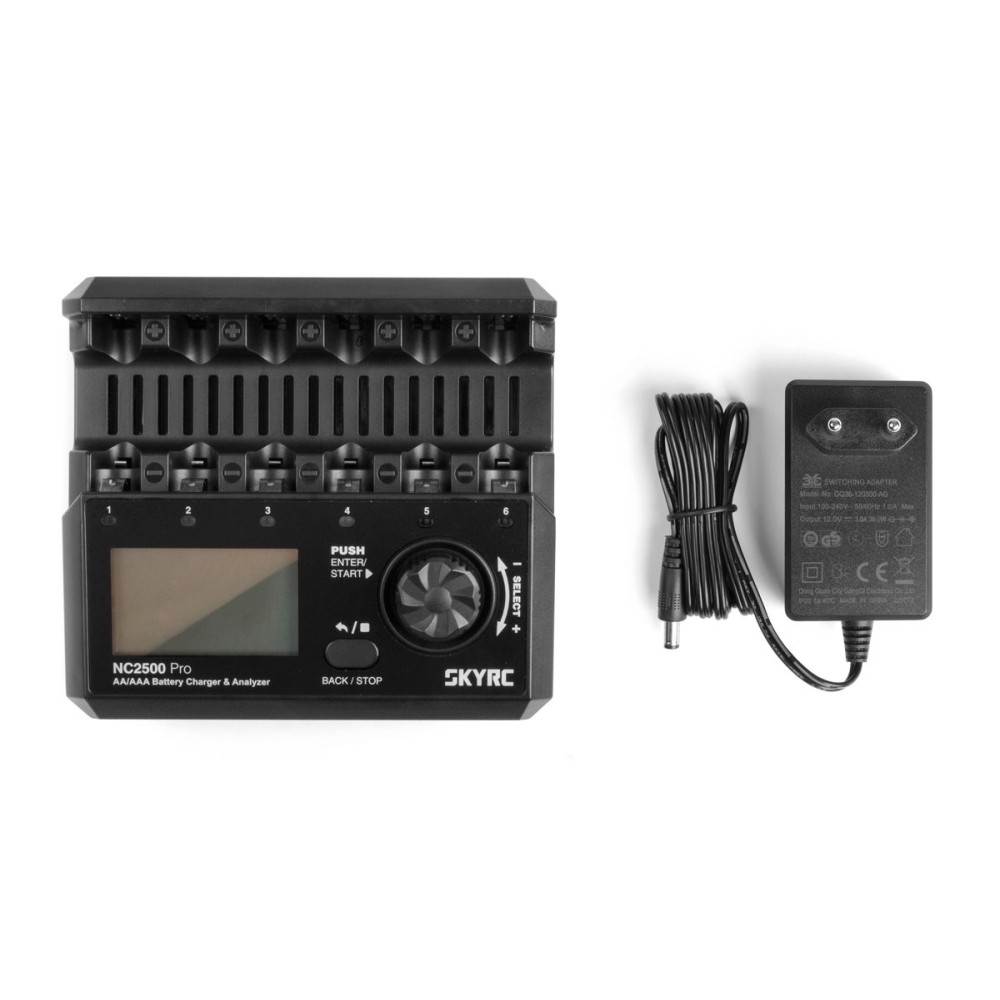 Nabíjení: NC 2500 Pro umožňuje současně nabíjet, vybíjet, formovat nebo oživovat až šest tužkových nebo mikrotužkových akumulátorů. Parametry probíhajícího procesu (nabíjecí/vybíjecí proud, nabitý/vybitý náboj, napětí akumulátoru, uplynulý čas) jsou průběžně zobrazovány pro všechny kanály na LCD displeji. LED indikátory u každého kanálu signalizují dobrý kontakt vloženého článku a provozní režim vybíjení nebo nabíjení. Provoz kanálů NC2500 Pro je synchronní – stačí vložit 1-6 akumulátorů stejného druhu, zadat parametry nabíjení nebo jiného provozního režimu a poté jedním stiskem tlačítka odstartovat stejný proces pro všechny „obsazené“ kanály. (Pokud požadujete možnost v každém kanálu používat jiný nabíjecí/vybíjecí program, volte nabíječ Sky RC NC2200.) Při nabíjení NC2500 Pro bere ohled i na vnitřní odpor článků - je-li příliš vysoký, automaticky omezí nabíjecí proud, aby nedocházelo k jejich přehřívání. Můžete také zvolit speciální režim nabíjení po krocích - to umožňuje nastavit průběh nabíjení ve třech krocích s různými nabíjecími proudy, které se přepínají po dosažení nastavené hodnoty dodaného náboje. Můžete tak např. nastavit šetrnější průběh nabíjení s proudem klesajícím v závislosti na dodaném náboji a prodloužit tak životnost vašeho akumulátoru.