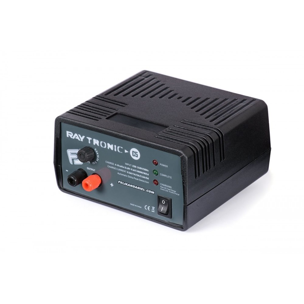 Nabíječ Raytronic C5 je velmi jednoduchý nabíječ pro rekreační jezdce a letce pro nabíjení 4–8čl. NiMH akumulátorů s napájením ze sítě. Je výkonnější náhradou „krabičkových“ nabíječů obvykle dodávaných v RC setech aut a lodí dovolující nabíjet proudem až 5A – pokud potřebujete. Umožňuje jednoduché nabíjení bez složitého nastavování doma stejně jako na letišti nebo u vody, pokud je k dispozici síťová zásuvka. Nabíjecí proud můžete nastavit na 0,5, 1, 2, 3,5 nebo 5 A. Činnost nabíječe je signalizována třemi LED diodami, nabíjení řídí automatika s delta-peak detekcí konce nabíjení. Po skončení nabíjení nabíječ přejde na udržovací nabíjení malým proudem.