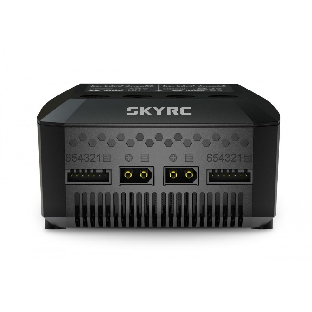 Nabíječ je v obou kanálech vybaven výstupními zásuvkami XT60 a univerzálními zásuvkami pro servisní konektory JST-XH umožňující přímo zapojit silové kabely akumulátoru a servisní konektory JST-XH sad 2-6S – pokud používáte sady s konektory XT60 a JST-XH, obejdete se zcela bez nabíjecích kabelů a adaptérů. Pro připojení servisních konektorů jiných systémů můžete použít standardní adaptéry Sky RC nebo RC System.