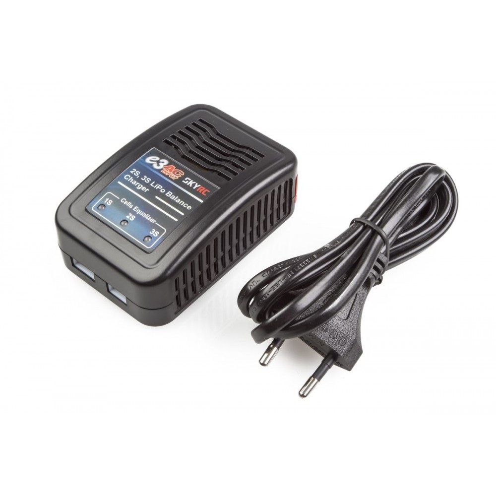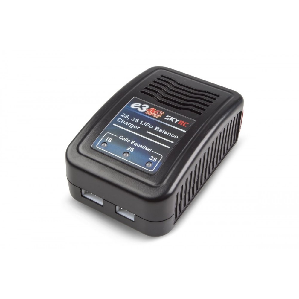 Nabíječ SKY RC e3 s vestavěným balancerem je velmi jednoduchý "krabičkový" nabíječ pro rekreační jezdce a letce se síťovým napájením pro nabíjení Li-poly akumulátorů. Je ideálním doplňkem "setových" stavebnic umožňující jednoduché nabíjení doma nebo výborným společníkem na cesty, kdy s sebou nechcete "tahat" velký, těžký a drahý nabíječ. Nabíjený akumulátor se připojuje k vestavěnému balanceru prostřednictvím servisního konektoru; nabíječ je opatřen dvěma zásuvkami (2s, 3s) pro konektory systému JST-XH. V jednu chvíli je možno nabíjet vždy jen jednu sadu - buď dvoučlánkovou, nebo tříčlánkovou.