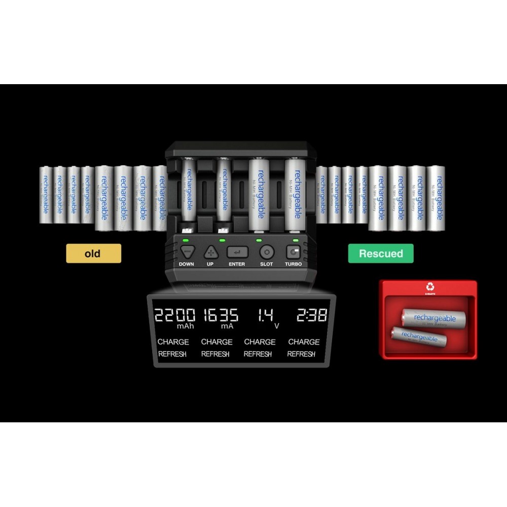 Čtyřkanálový nabíječ jednotlivých článků velikosti AA a AAA NiMH/NiCd proudem 0,2-2,0 A se síťovým napájením. Inteligentní provozní režimy nabíjení, rychlonabíjení, vybíjení, ořivování+analýz a formování poskytují komplexní péči o akumulátory. Přehledný LCD displej se zobrazením napětí, proudu, kapacity a času. Možnost bezdrátového ovládání v mobilní aplikaci (po připojení doplňkového Bluetooth modulu).