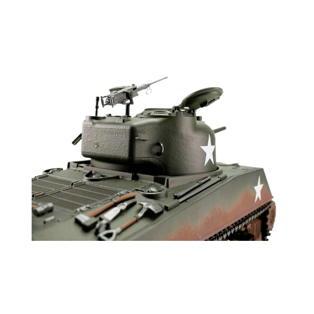 Výkonný model tanku má RC ovládání 2,4 GHz. Vozidlo je vybaveno BB Airosft systémem, takže jsou možné bitvy jako v reálném boji. Motory s optimalizovaným točivým momentem dodávají modelu Sherman 75mm přesnou a plynulou jízdu. Kovové převody s robustními převody a vylepšeným převodem zajišťují větší výkon. Díky proporcionálnímu ovládání se můžete s tankem přiblížit velmi pomalu a plynule zvyšovat rychlost. Sherman 75mm se pohybuje dopředu a dozadu, také s otočením doleva a doprava. Lze jej také na místě otočit doleva nebo doprava. Můžete zvednout a spustit dělo a otočit věž o 360 stupňů. Realistický zážitek završují různé zvuky motoru a kouř z výfuku.