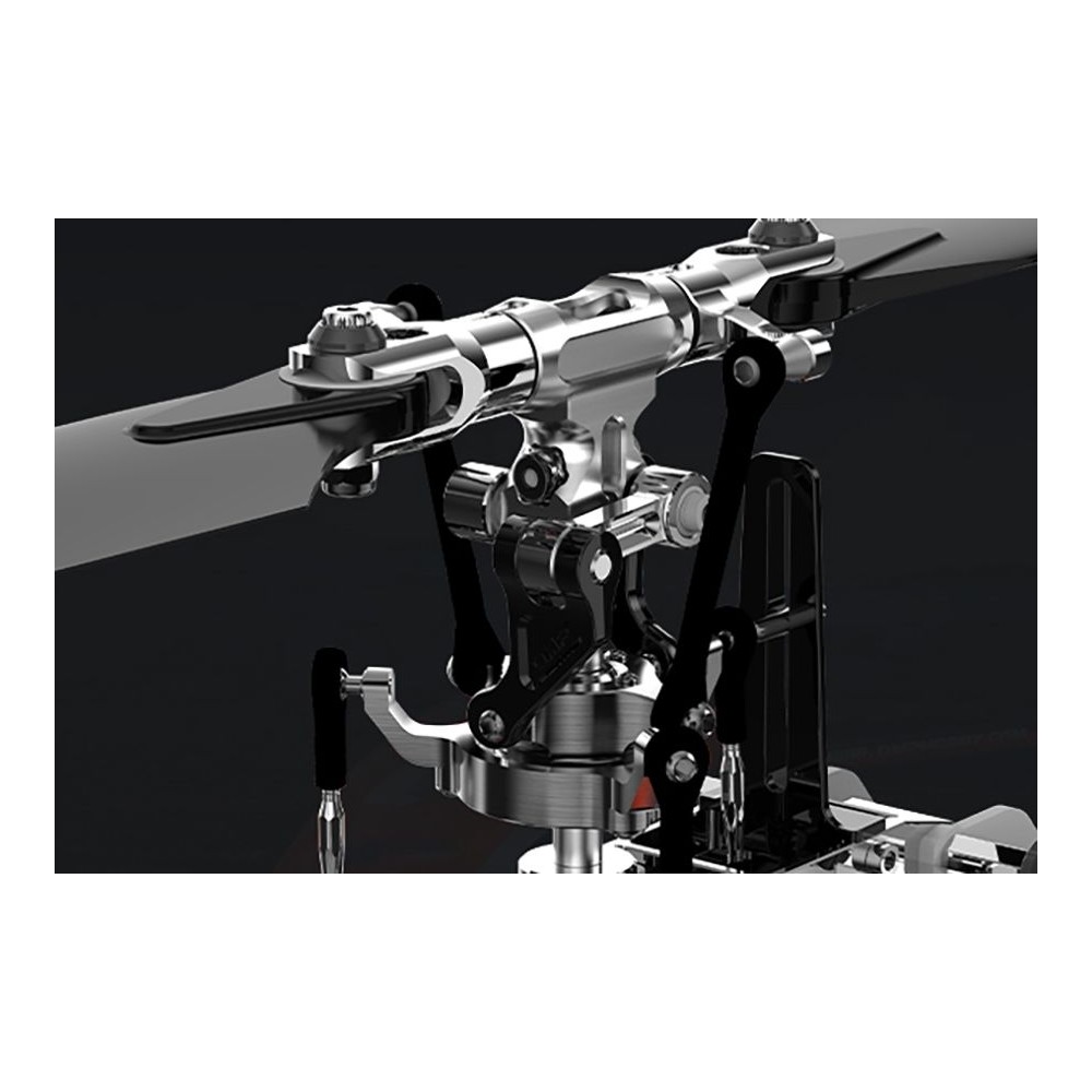 Robustní 4 mm hlavní hřídel je uložena v kuličkových ložiscích. Deska cykliky je duralová stejně jako rotorová hlava s unašeči listů. Díky 3G flybarless systému a elektronickému CCPM je rotorová hlava s optimalizovanou geometrií velmi jednoduchá. Unašeče listů nosného rotoru jsou nádhernou miniaturou unašečů „velkých" RC vrtulníků - se všemi těmi kuličkovými ložisky a tlumícími vložkami!