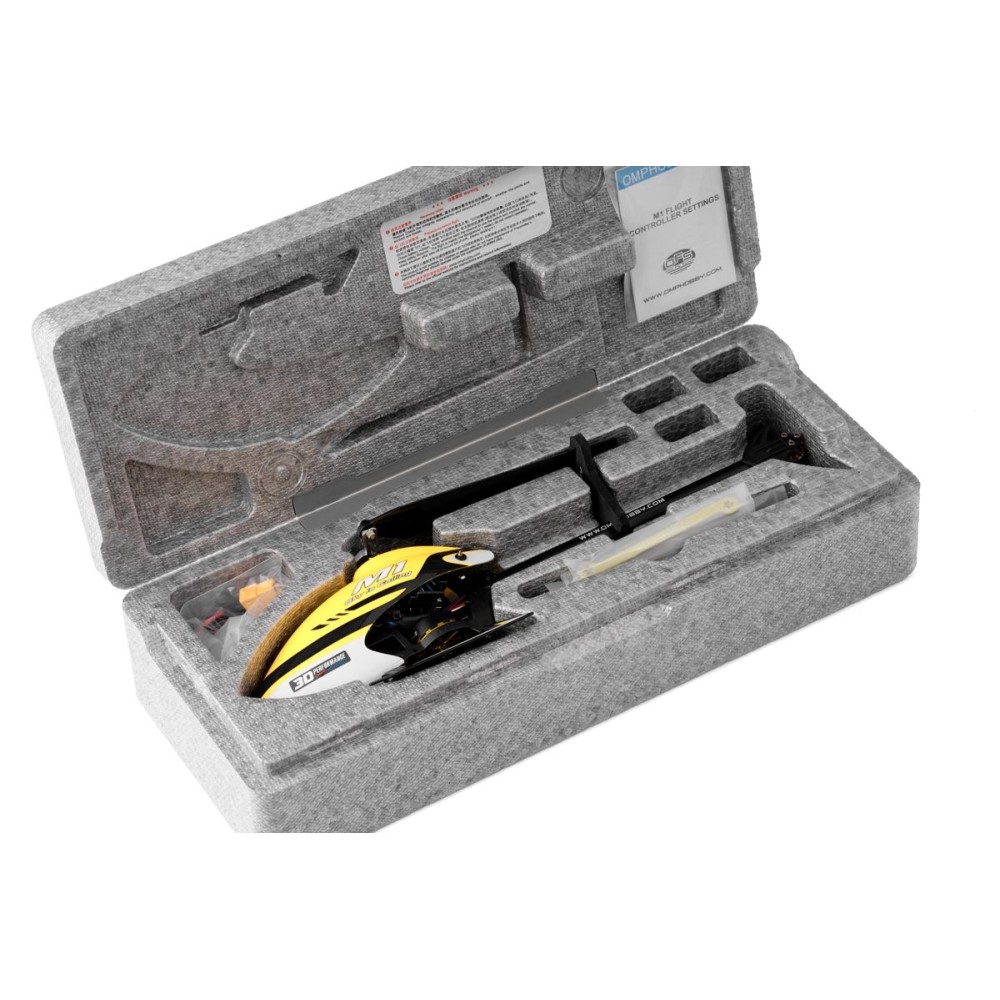ARF set vrtulníku obsahuje: 100% sestavený a k letu připravený model M1 V1, pohonný akumulátor LiPo 7,4 V 350 mAh 50C, imbusový šroubovák, plochý klíč, nabíjecí kabel, pevnou krabici z pěnového EPP s odklopným víkem pro bezpečné přepravování a skladování modelu, návod k obsluze modelu a nastavování řídící jednotky.