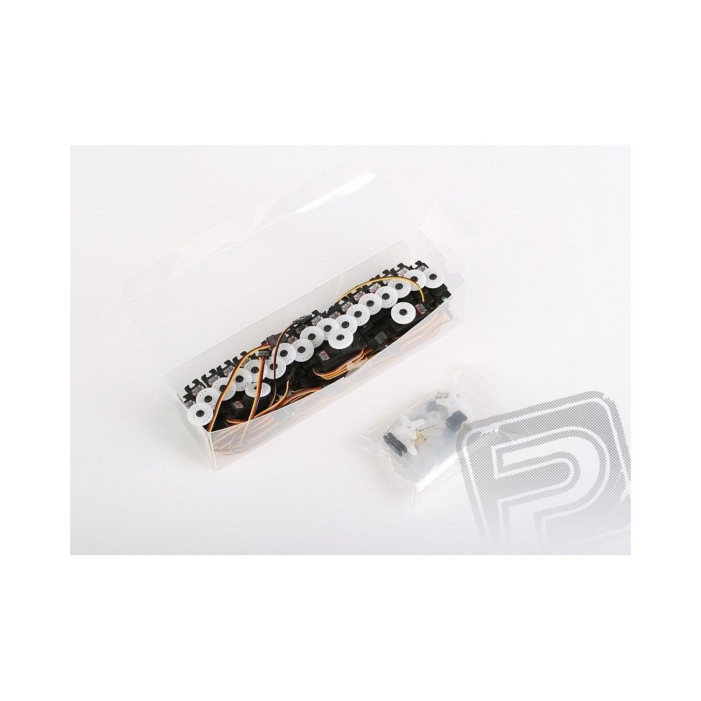 Rychlé mikroservo 19g s kovovými převody pro menší elektrolety a větroně. Tah 2,8kg/cm, rychlost 0,12s/60st při 4,8V. Tah 3,4kg/cm, rychlost 0,1s/60st při 6,0V. Bulk balení 20ks v jedné krabičce, příslušenství v plastových sáčcích.