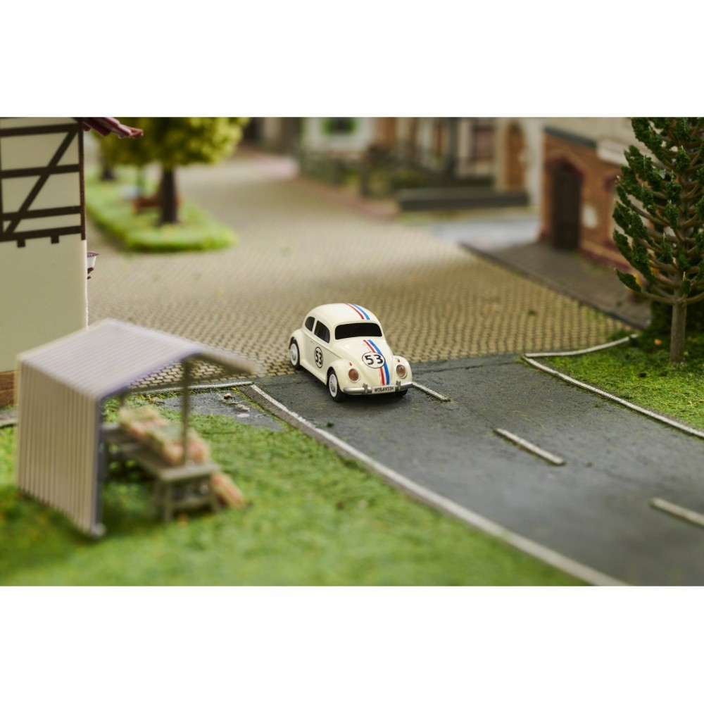 High-tech licencovaný model VW Beetle Rallye RTR pro železniční kolejiště, plně proporcionální s LED osvětlením a realistickými zvuky v měřítku 1:87.