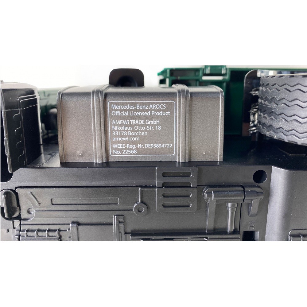 Tento do detailu propracovaný licencovaný RC model sklápěče Mercedes-Benz Arocs pracuje na frekvenci 2,4Ghz, jede vpřed, vzad a zatáčí jako skutečné auto. Model je poháněn nabíjecím akupakem. Dálkové ovládání je na čtyři tužkové baterie AA a ovládá 16 funkcí.