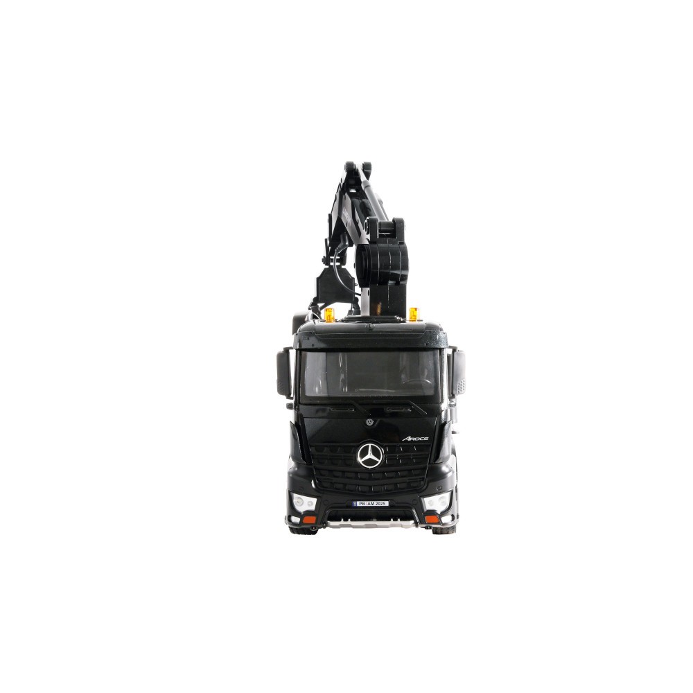RC nákladní vůz Mercedes-Benz Arocs v měřítku 1:18 se sklápěčem nabízí všestrannou zábavu a detailní prvky pro děti od 8 let. Funkční ruka je proporcionálně ovládaná, což umožňuje obzvláště přesné pohyby. Elektrický drapák na klády a šrot umožňují realistické zvedání a přepravu různých materiálů. Součástí je i jeřábový hák. Sklápěcí korba je vybavena dálkově ovládanou funkcí sklápění a boční stěny lze ručně otevírat pro ještě větší rozmanitost při vykládání. Tento oficiálně licencovaný model je dodáván ve speciálním metalickém černém laku a může se pochlubit dalšími technickými vlastnostmi: Proporcionální jízdní funkce a výkonný pohon všech 4 kol s řízením všech 4 kol zajišťují autentický zážitek z jízdy. Zvukový modul s výstražným tónem pro couvání a LED světly vpředu, vzadu a na kabině řidiče dále umocňuje realistický vzhled. Drapák je vybaven ochrannou převodovky, zatímco měkké gumové pneumatiky poskytují vynikající trakci. Sada RTR je připravena k použití ihned po vybalení z krabice a obsahuje dálkové ovládání, baterii, nabíjecí kabel a další příslušenství. S dobou provozu až 20 minut nic nebrání delšímu hraní. Tento jeřábový nákladní automobil Mercedes-Benz Arocs se sklápěcí korbou kombinuje robustní konstrukci, detailní design a rozsáhlou funkčnost v jednom modelu.