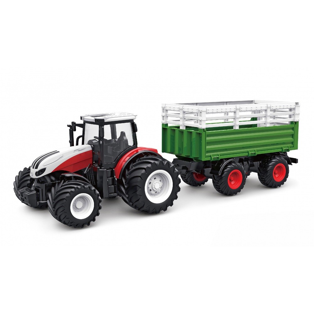 Velice pěkně zpracovaný RC model traktoru s přívěsem na dálkové ovládání. Provedení modelu je opravdu krásné, předností modelu jsou také velká široká kola, přední světla a zvuk motoru. Další přednost je pomalá jízda, zpřevodováno do síly tak jak to u traktoru má být! Slušná vydrž akumulátoru umožňuje jízdu až 35 minut. Akumulátor v traktoru je měnitelný. Ovladač modelu nemá anténu ani páčky a to je dobré, protože děti nemají co ulomit. Traktor svítí a vydává realistické zvuky, jezdí vpřed, vzad, doleva, doprava. Poháněn je na veliká zadní kola, která jsou vybavena měkkými pneumatikami z pryže s hlubokým vzorkem. Kabina řidiče je vyladěná do posledního detailu a kompletně uzavřená. DEMO funkce předvede bez vašeho zásahu pohyby traktoru.