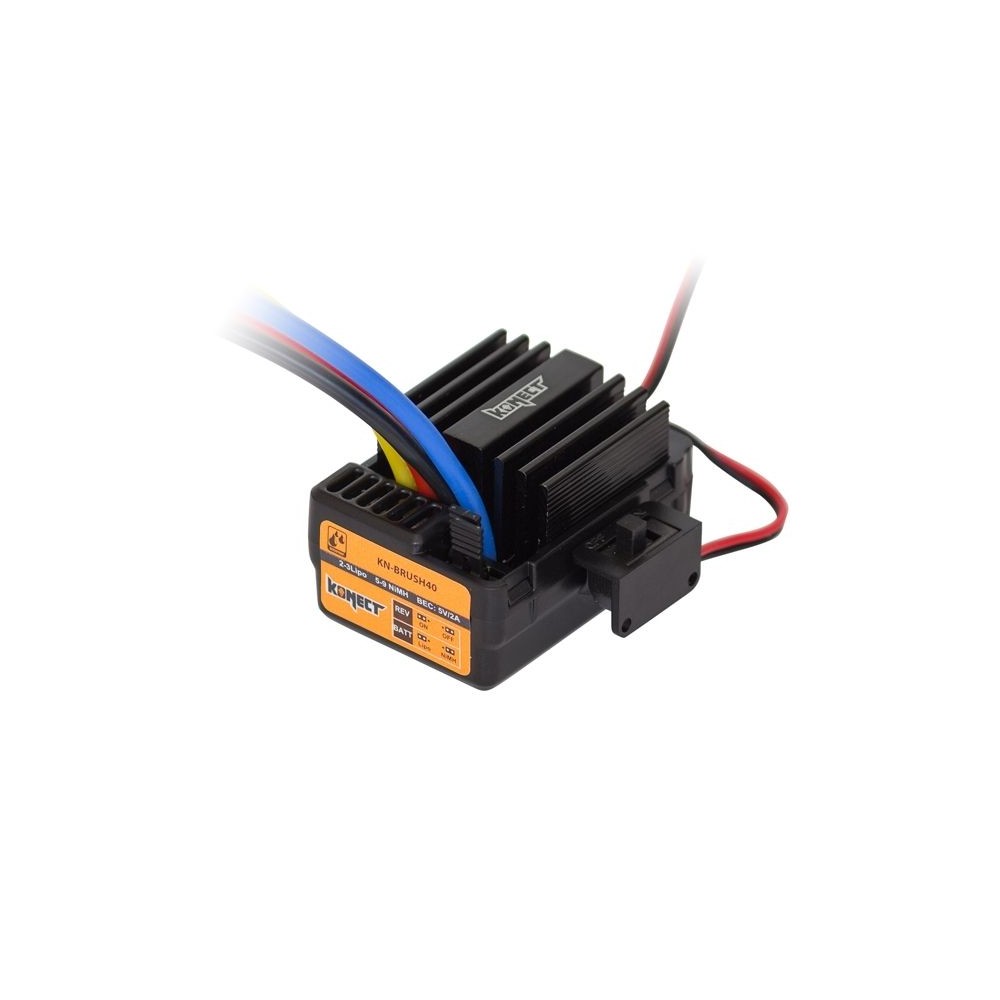 Regulátor s trvalým zatížení 40A je vodotěsný a má BEC, který poskytuje 5V s napájením 2A, a proto je dostatečný pro všechny oblasti použití běžné v tomto měřítku. Pomocí přepínacích můstku lze snadno přepínat mezi provozem LiPo a NiMH, není nutné žádné časově náročné programování. Zpětný chod lze také v případě potřeby jednoduše deaktivovat, což může být výhodou, zejména při závodění.
