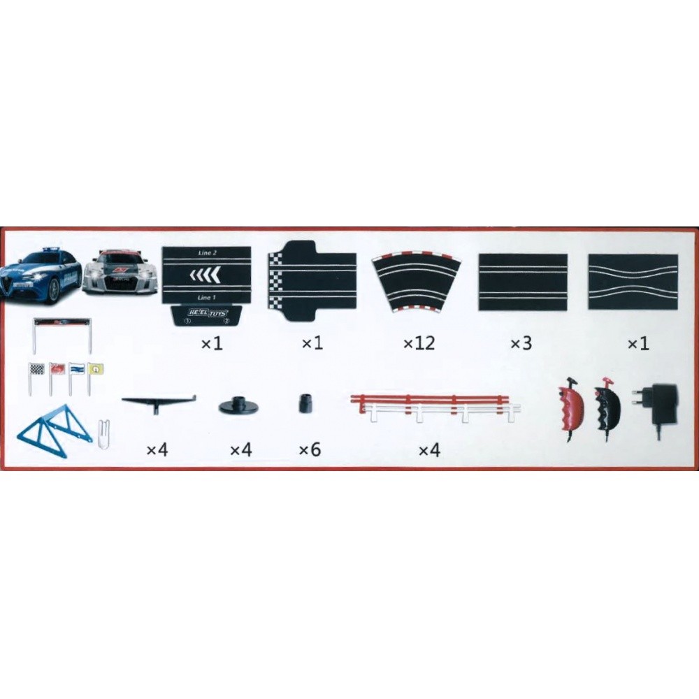 Elektrická autodráha v měřítku 1:43, na které se prohánějí dva velmi výkonné vozy AUDI R8 LMS GT3 a ALFA ROMEO POLIZIA. Věrně reprodukované vozy s předními světly a funkcí TURBO.