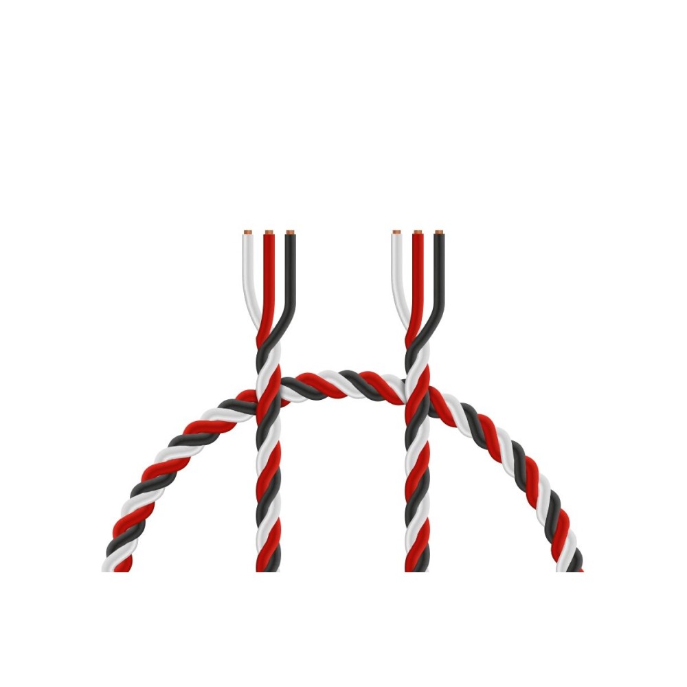 Kroucený třížilový kabel tlustý v barvách Futaba (černá/červená/bílá) s PVC izolací, průřez vodičů 0,25 mm2. Vysoce ohebný, lanka ze 65 pramenů 0,07 mm, max. 48 V, 5A. Průměr 1,5/2,9 mm.Vyrobeno v Německu. Cena za 1 meter