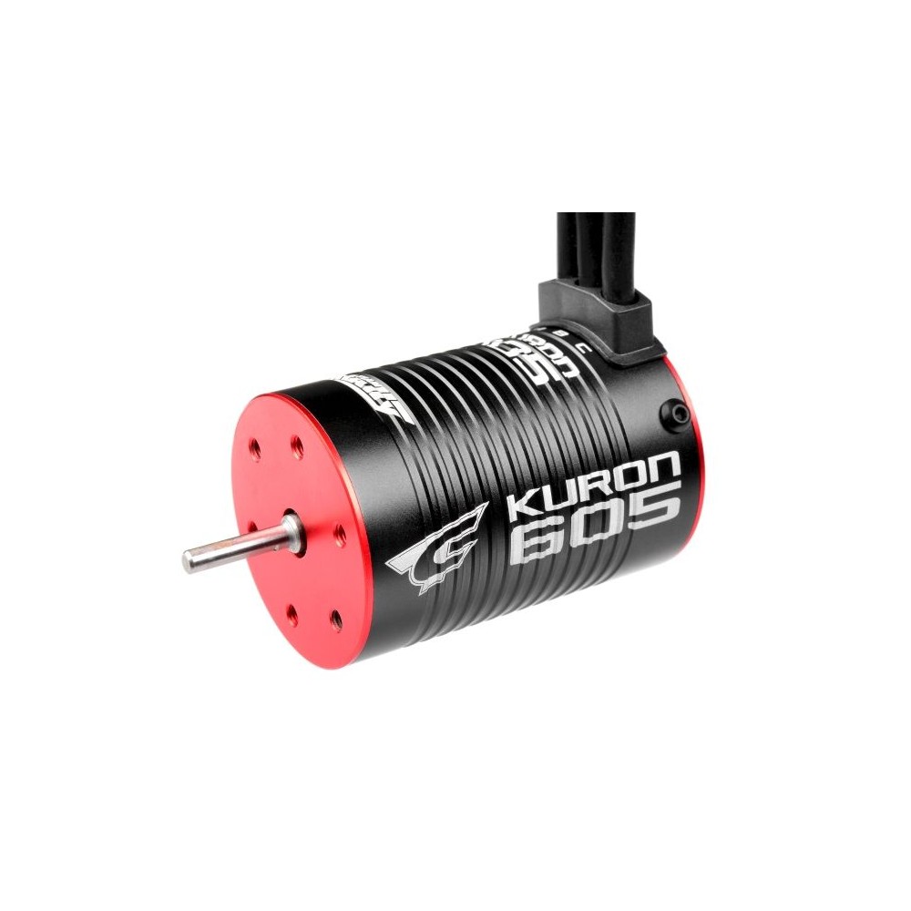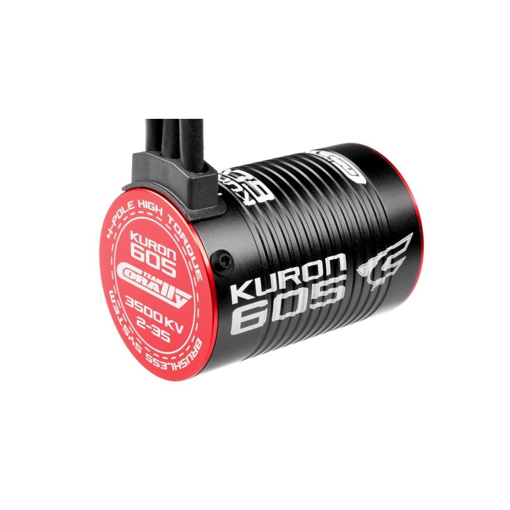 TEAM CORALLY KURON 605 střídavý motor bezsenzorový. Provozní napětí: 5-12,6V, délka samotného těla 52mm, průměr: 36mm, váha: 205g, otáčky na 1Volt: 3.500 o/min, hřídel 3,17mm, 4 polový, délka samotné hřídele 15mm.