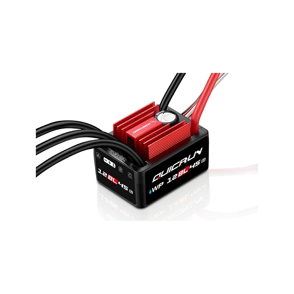 Elektronický střídavý regulátor 45A řady QuicRun pro motory bez senzorů; kompletně voděodolný a prachuvzdorný s vestavěným výkonným spínaným BEC obvodem 6-7,4V/4A určený pro silniční i terénní auta, 1:12/1:14 a vhodný také pro makety lodí. Napájení 2-3S LiPo, ideální pro bezsenzorové střídavé motory velikosti 28xx.
