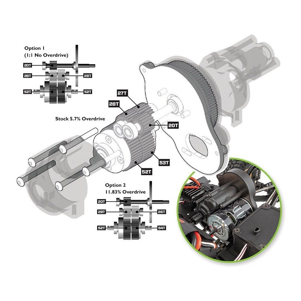 Převodovka Stealth(R) X: V centru podvozku Knightrunner 4X4 je revoluční převodovka Stealth(R) X od společnosti Associated Electrics. Tato převodovka se od ostatních liší možností nastavit nezávisle na sobě převodové poměry předního a zadního pohonu ve třech různých úrovních. Po vybalení z krabice je převodovka Stealth(R) X dodávána s předinstalovanými převody s 5,7% přeřazením. Jako bonus jsou součástí dodávky i převody s 11,83% přeřazením, které však nejsou nainstalovány. Samostatně je k dispozici možnost převodového poměru jedna ku jedné pro ty, kteří chtějí pohánět přední a zadní převodovku stejně.