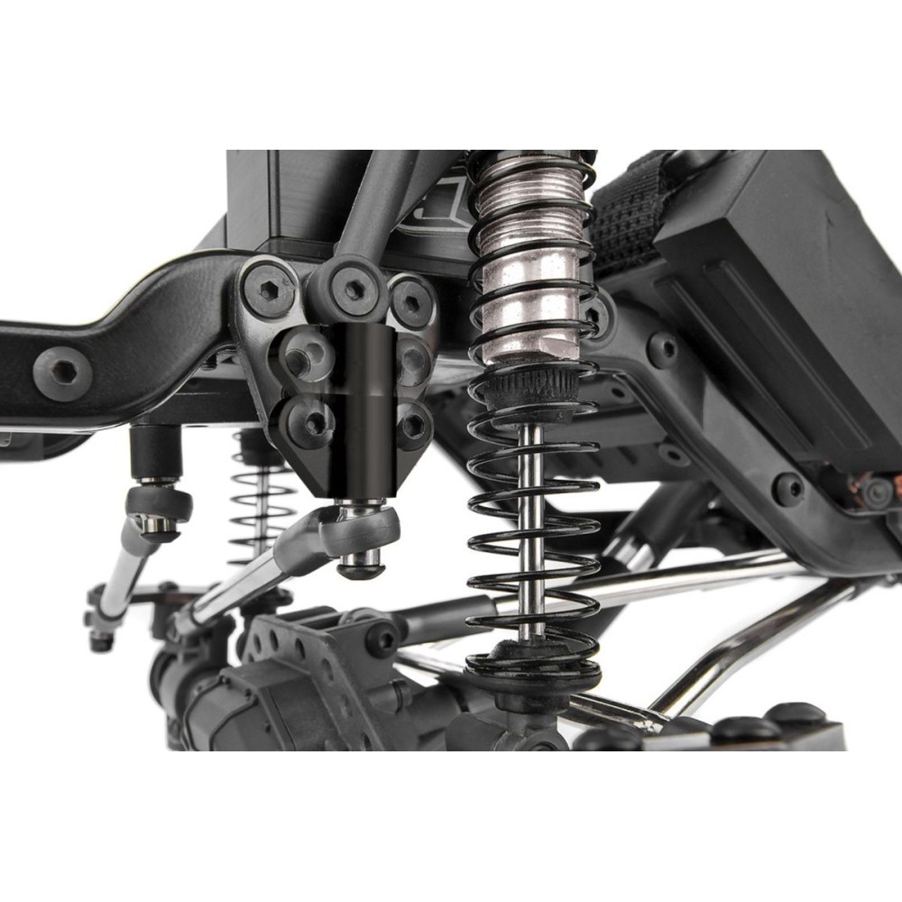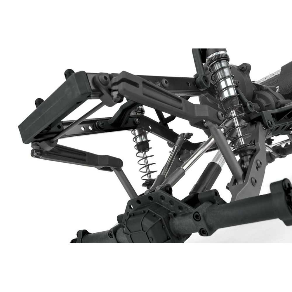 Čím je Enduro Ecto Trail Truck výjimečný? Balíček odpružení Gatekeeper (GKSTM)! Balíček GKSTM se skládá ze zadních vlečných ramen, která posouvají tlumiče dopředu, což umožňuje větší okno pro ladění tlumičů a zajišťuje lepší rozložení hmotnosti. Vlečná ramena jsou spojena se zadní protiprokluzovou tyčí pro stabilnější a konzistentnější odpružení při plazení po skalách. Nastavitelný hliníkový držák pásové tyče pevně přišroubovaný k liště podvozku poskytuje modelu Enduro Ecto spolehlivější a citlivější řízení bez prohýbání. Naše vložky pro uchycení tlumičů s několika montážními pozicemi umožňují přesné vyladění odpružení, ať už se jedná o posunutí tlumičů nahoru, dolů, dopředu nebo dozadu.