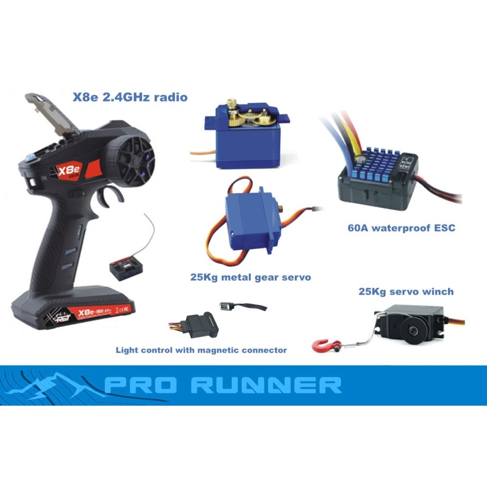 Moderní design karoserie s průhlednými okny dotváří řada realistických doplňků a propracované světlomety. Ty jsou ovládané pomocí dedikovaného světelného modulu s magnetickým konektorem usnadňujícím zapojení. Z výbavy předchozího modelu nechybí ani vestavěný naviják poháněný 25kg 360stupňovým servem s 90 cm dlouhým lankem.