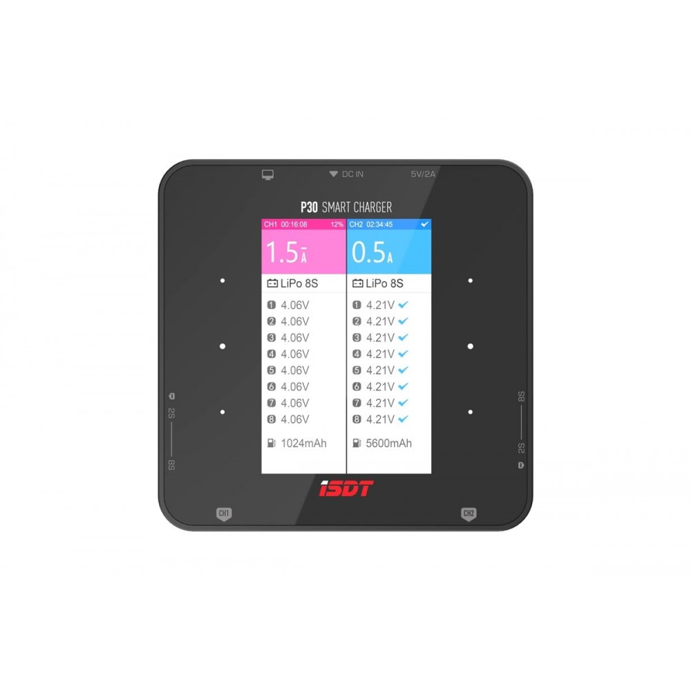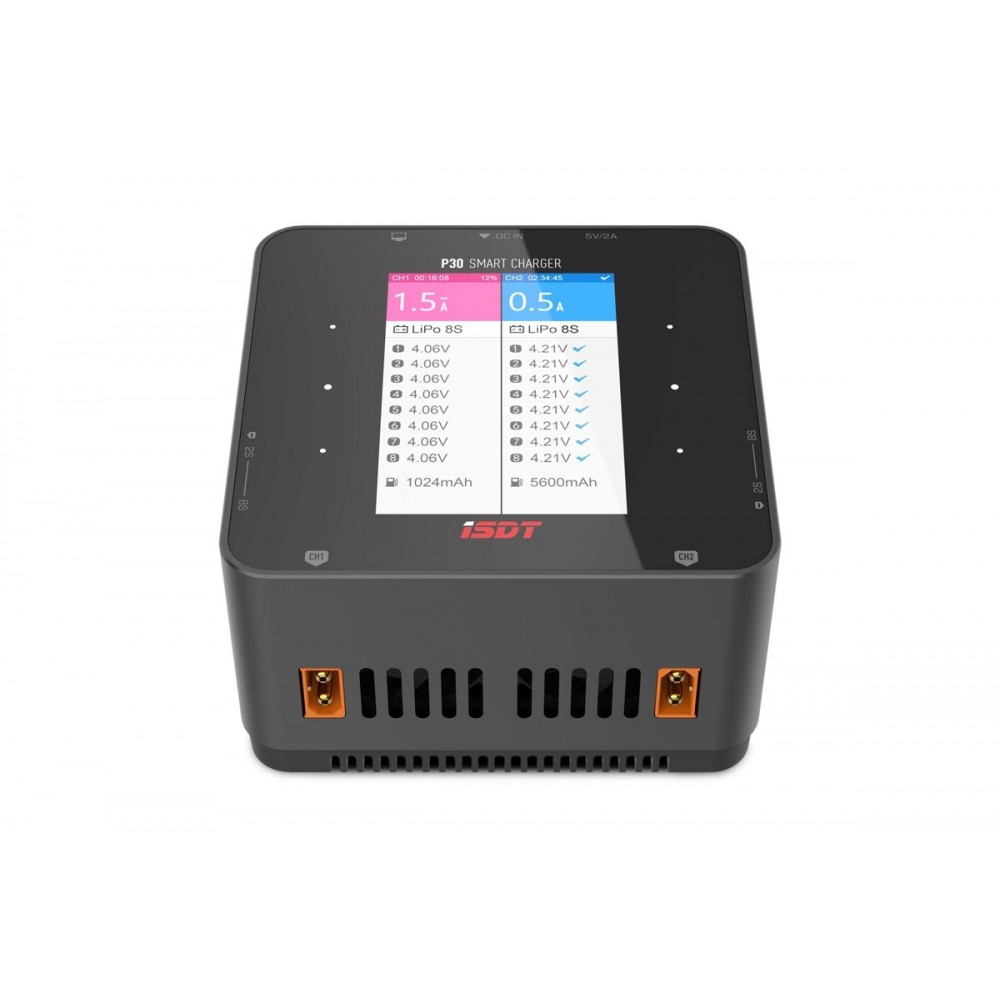 Vysokovýkonný dvoukanálový nabíječ ISDT P30 1500W je inteligentní nabíječ s napájením z autobaterie nebo výkonného stabilizovaného síťového zdroje a velmi jednoduchou a přehlednou obsluhou. P30 umožňuje nabíjet a vybíjet běžné typy článků (NiCd, NiMH, LiPo, LiHV, ULiHV, Li-ion, LiFe, Pb), navíc je vybaven vestavěnými osmikanálovými balancery, které zajišťují bezpečné nabíjení lithiových akumulátorů. Nabíječ je vybaven barevným LCD displejem a dotykovými programovacími tlačítky, které vám poskytnou možnost komfortního a velice přehledného nastavování parametrů, řízení a sledování průběhu nabíjení.