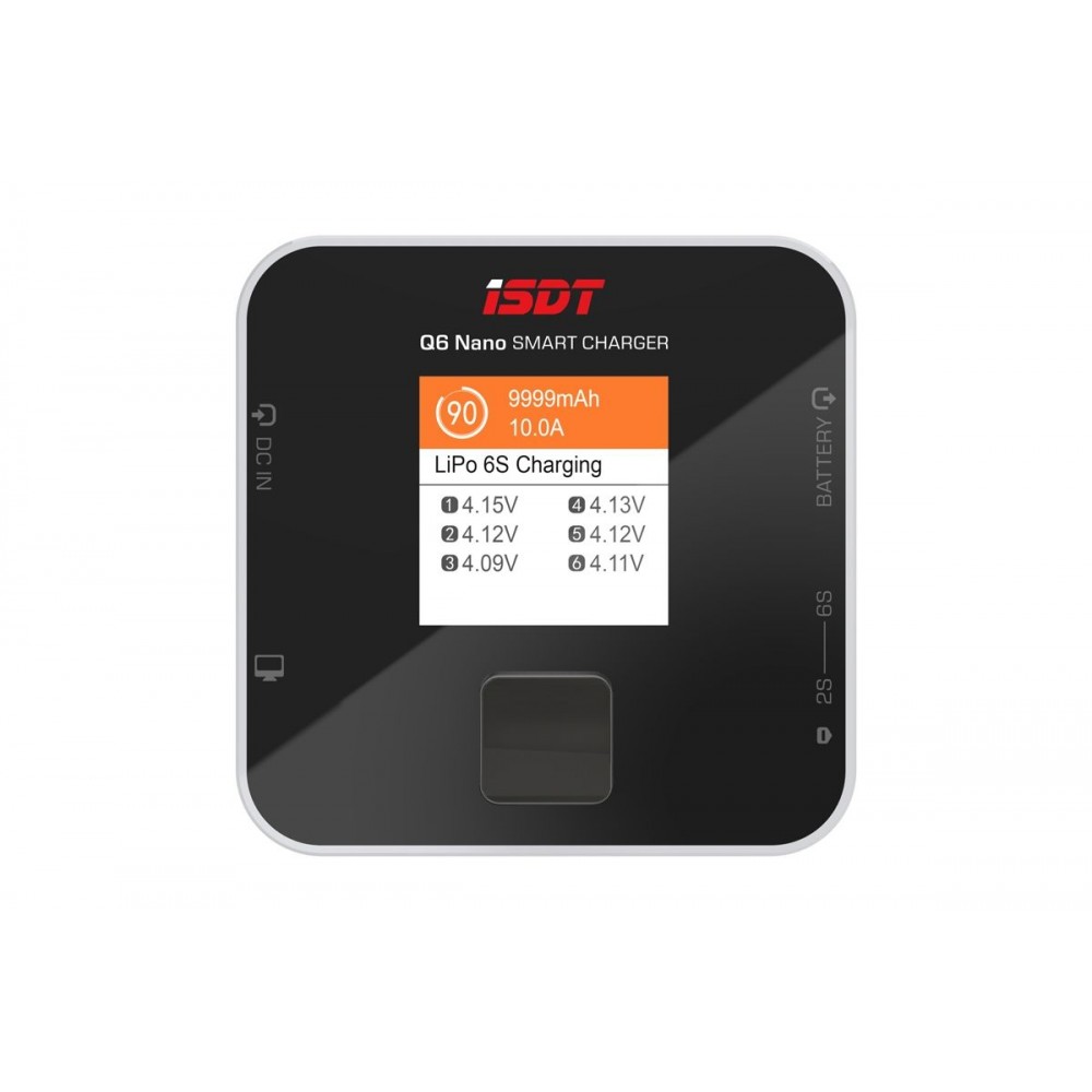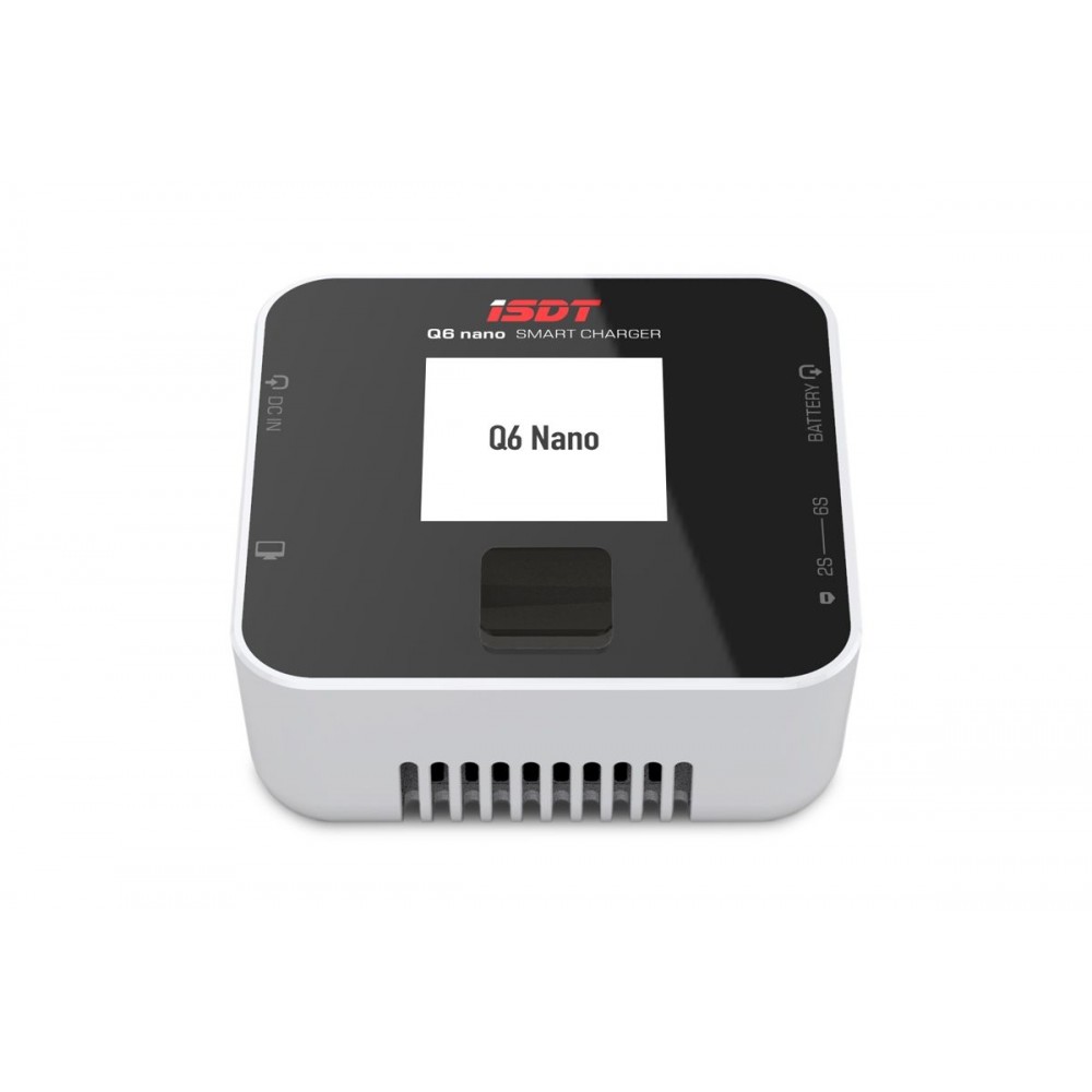 Miniaturní nabíječ ISDT Q6 Nano 200W je inteligentní nabíječ s napájením z autobaterie nebo stabilizovaného síťového zdroje a velmi jednoduchou a přehlednou obsluhou. Q6 Nano umožňuje nabíjet a vybíjet běžné typy článků (NiCd, NiMH, LiPo, LiHV, ULiHV, Li-ion, LiFe, Pb), navíc je vybaven vestavěným šestikanálovým balancerem, který zajišťují bezpečné nabíjení lithiových akumulátorů. Nabíječ je vybaven barevným LCD displejem a třícestným programovacím tlačítkem, který vám poskytne možnost komfortního a velice přehledného nastavování parametrů, řízení a sledování průběhu nabíjení/vybíjení.