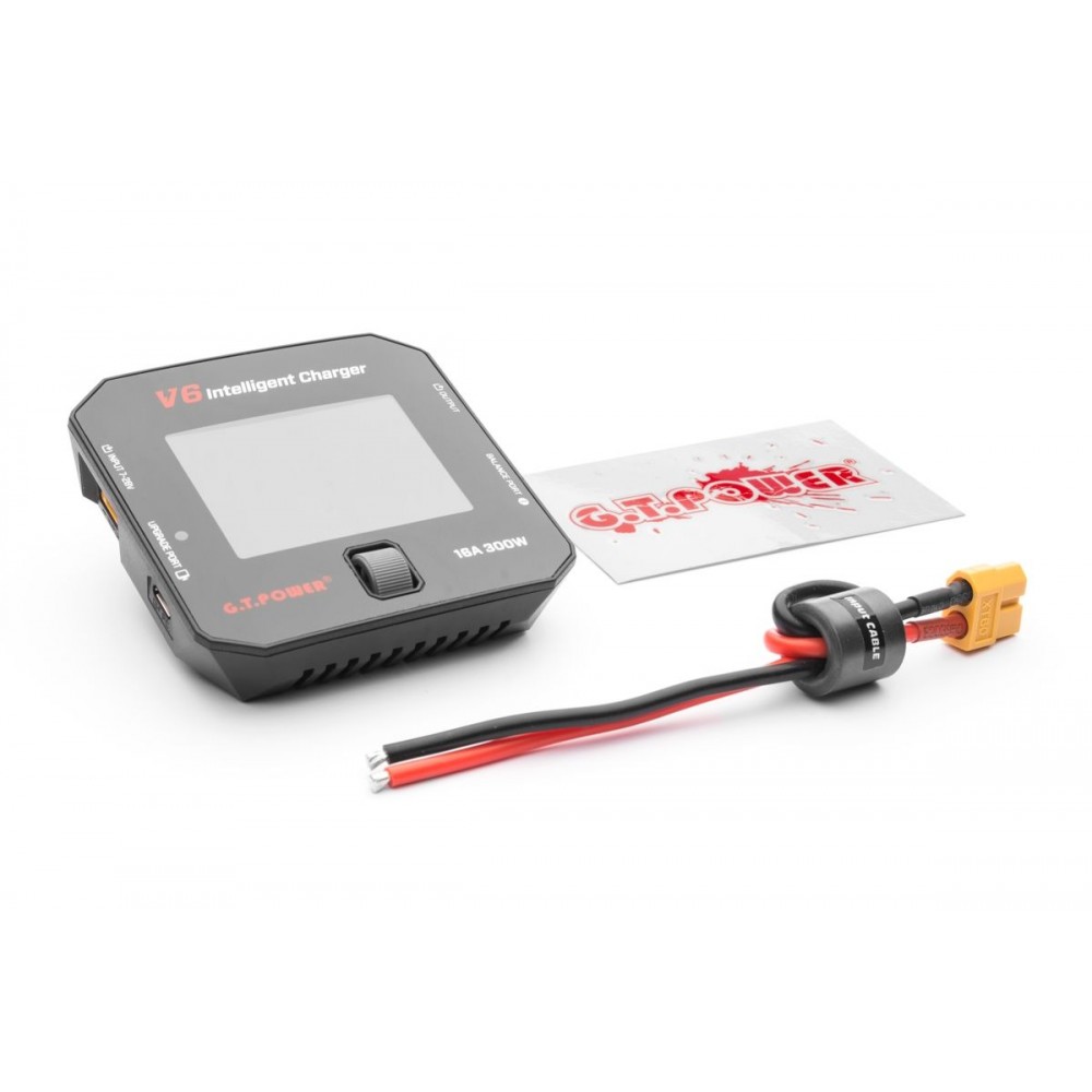 Nabíječ G.T. POWER V6 300W byl konstruován se snahou nabídnout inteligentní kapesní nabíječ s velkým výkonem a velmi jednoduchou a přehlednou obsluhou. V6 umožňuje nabíjet a vybíjet běžné typy článků (NiCd, NiMH, LiPo, LiHV, Li-ion, LiFe, Pb), navíc je vybaven vestavěným šestikanálovým balancerem, který zajišťuje velmi bezpečné a komfortní nabíjení lithiových akumulátorů.