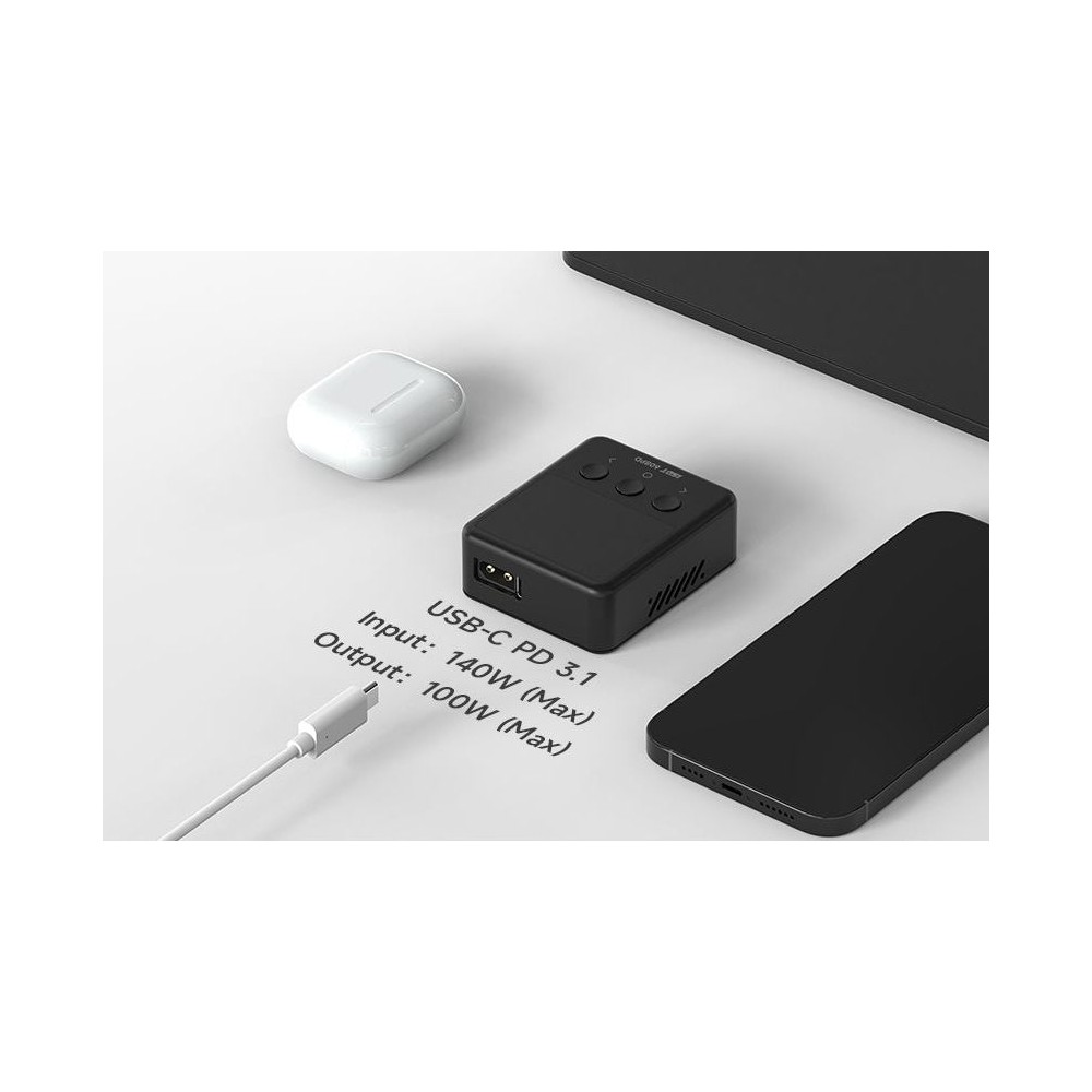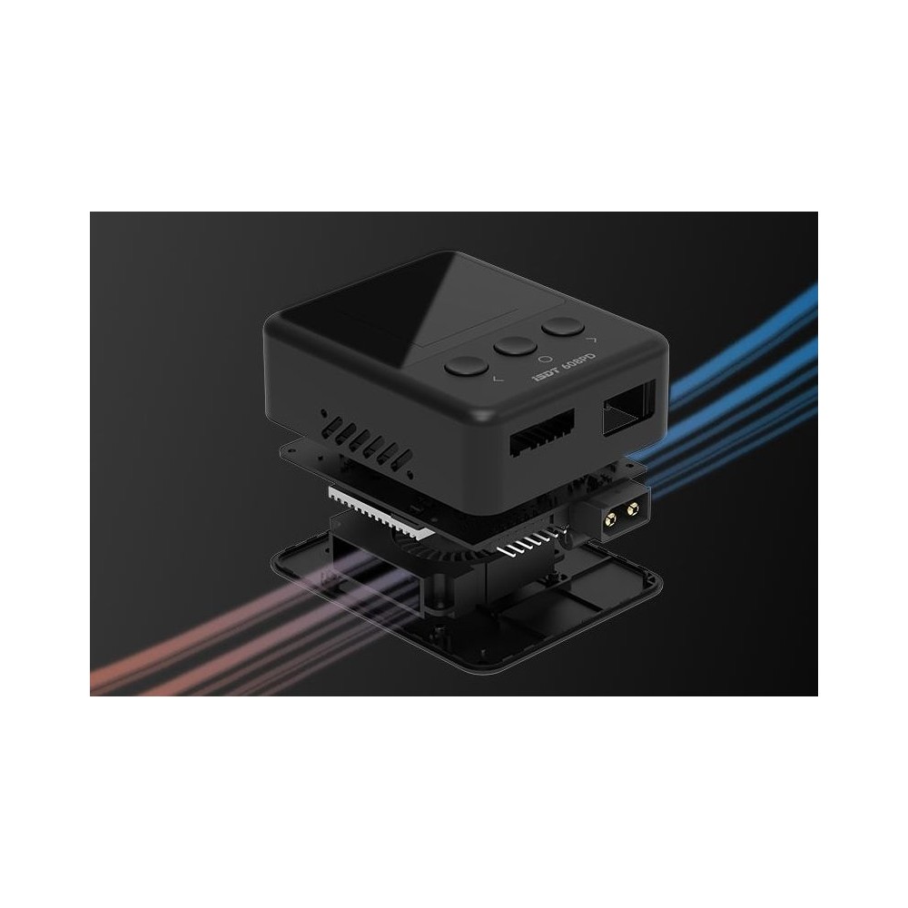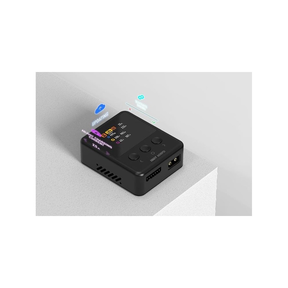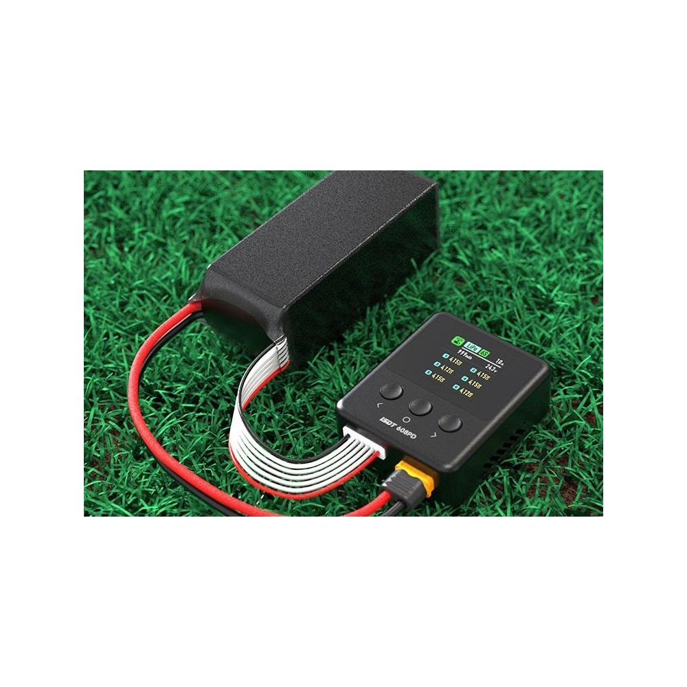 Miniaturní nabíječ ISDT 608PD 240W je výkonný inteligentní nabíječ s napájením z autobaterie, stabilizovaného síťového zdroje nebo USB-C zdroje s velmi jednoduchou a přehlednou obsluhou. 608PD umožňuje nabíjet běžné typy článků (NiMH, Li–Po, LiHV/ULiHV, LiFe, Pb), navíc je vybaven vestavěným šestikanálovým balancerem, který zajišťuje bezpečné nabíjení lithiových akumulátorů. Nabíječ je vybaven barevným LCD displejem a třemi programovacími tlačítky, které vám poskytnou možnost komfortního a přehledného nastavování parametrů, řízení a sledování průběhu nabíjení.