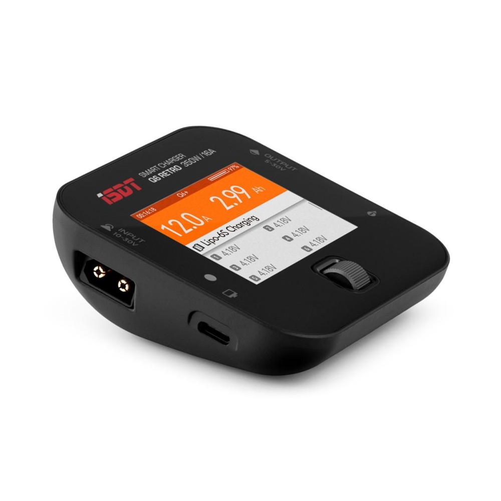 Miniaturní nabíječ ISDT Q6 Retro 350W je inteligentní nabíječ s napájením z autobaterie nebo stabilizovaného síťového zdroje a velmi jednoduchou a přehlednou obsluhou. Q6 Retro umožňuje nabíjet a vybíjet běžné typy článků (NiCd, NiMH, LiPo, LiHV, ULiHV, Li-ion, LiFe, Pb), navíc je vybaven vestavěným šestikanálovým balancerem, který zajišťují bezpečné nabíjení lithiových akumulátorů. Nabíječ je vybaven barevným LCD displejem a programovacím kolečkem/tlačítkem, který vám poskytne možnost komfortního a velice přehledného nastavování parametrů, řízení a sledování průběhu nabíjení/vybíjení.