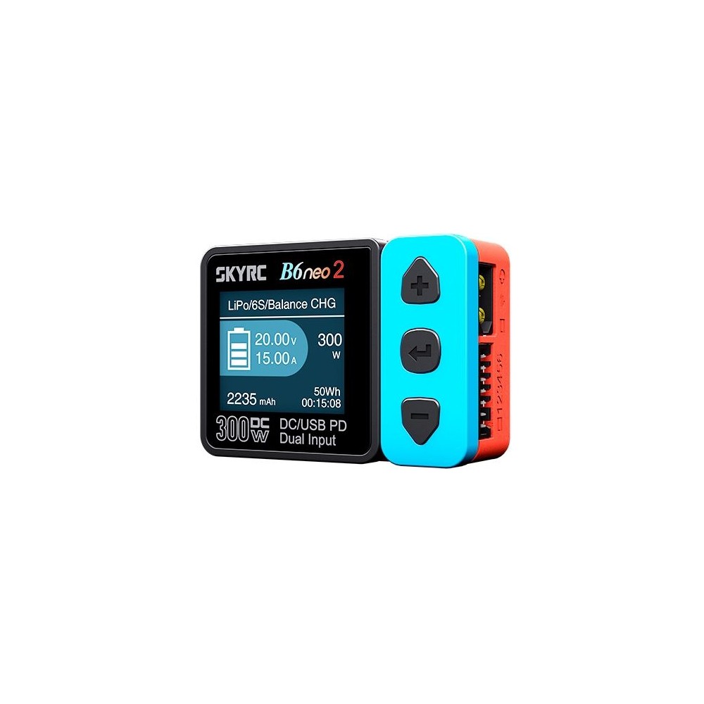 Miniaturní nabíječ SKY RC B6neo2 300W byl konstruován se snahou poskytnout vše potřebné pro nabíjení velkými proudy, s jednoduchou obsluhou, při velikosti „na půl dlaně“ nebo „do kapsičky u vesty“. B6neo2 umožňuje nabíjet a vybíjet běžné typy článků (NiCd, NiMH, Li-poly, Li-ion, Li-Fe, Li-HV, Pb), navíc je vybaven vestavěným šestikanálovým balancerem, který zajišťuje velmi bezpečné a komfortní nabíjení lithiových akumulátorů. Může také pracovat v režimu regulovaného napájecího zdroje s výstupním napětím nastavitelným v rozmezí 5-27 V a proudem 1-15 A.