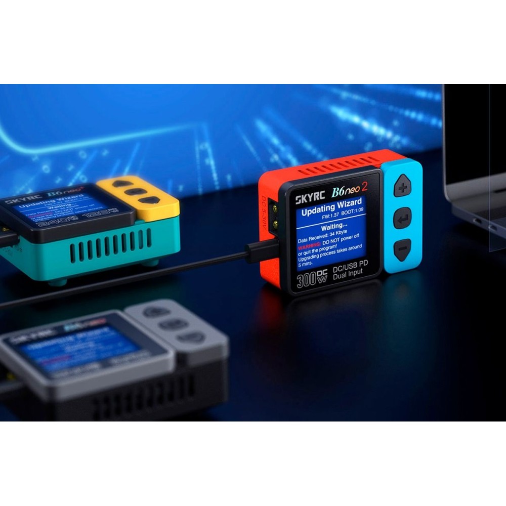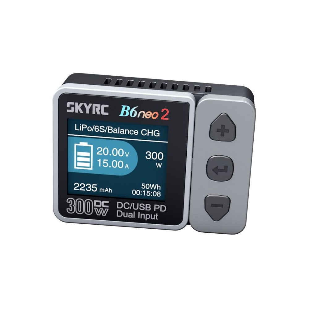 Miniaturní nabíječ SKY RC B6neo2 300W byl konstruován se snahou poskytnout vše potřebné pro nabíjení velkými proudy, s jednoduchou obsluhou, při velikosti „na půl dlaně“ nebo „do kapsičky u vesty“. B6neo2 umožňuje nabíjet a vybíjet běžné typy článků (NiCd, NiMH, Li-poly, Li-ion, Li-Fe, Li-HV, Pb), navíc je vybaven vestavěným šestikanálovým balancerem, který zajišťuje velmi bezpečné a komfortní nabíjení lithiových akumulátorů. Může také pracovat v režimu regulovaného napájecího zdroje s výstupním napětím nastavitelným v rozmezí 5-27 V a proudem 1-15 A.