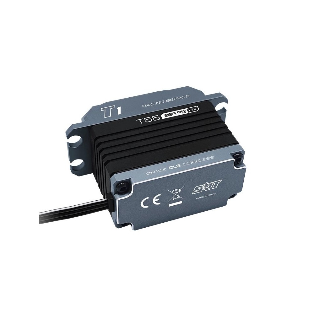 NOVÁ generace programovatelných CORELESS serva T 55HV speciálně navrženo pro 1/8 On/Off-Road modely s reakční rychlostí až 0,19s a 55kg/cm tahu/točivého momentu. Servo využívá celohliníkové pouzdro pro dosažení optimálních teplot ale i tuhosti, zatímco střídavý motor a ocelovými převody zajišťují vysoký výkon a trvanlivost. Servo je vybaveno JR konektorem o délce 300mm v černé barvě.