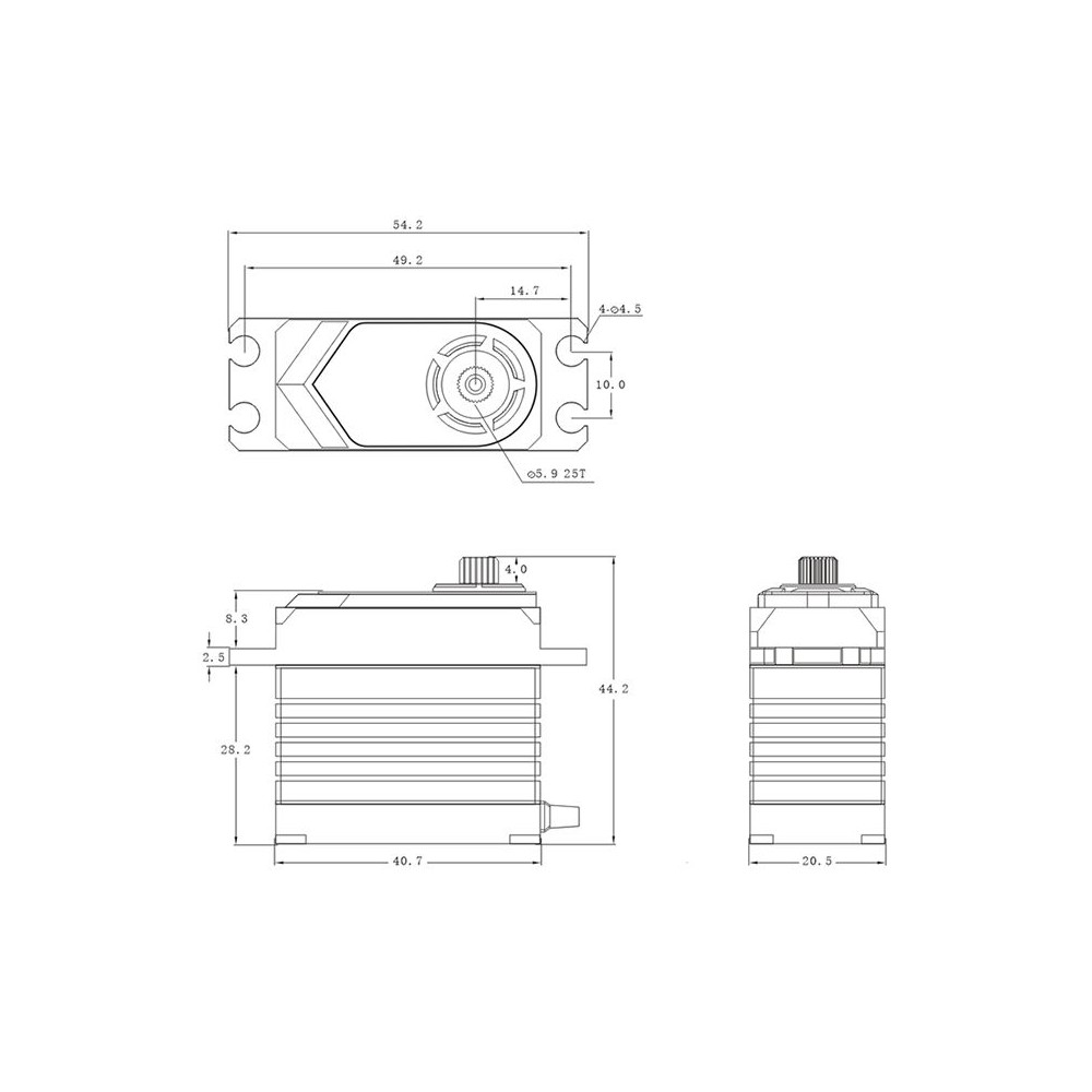Digitální nízkoprofilové HiVolt standard servo s Brushless (střídavým) motorem a kovovými převody.