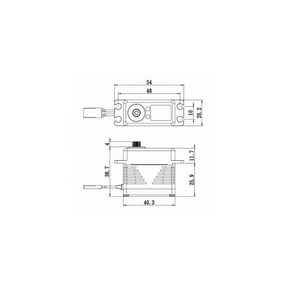Digitální HiVolt standard servo s Brushless (střídavým) motorem a kovovými převody, 3x kuličkové ložisko, 45,0/55.0/70kg při 6,0/7,4/8,4V a 0,16/0,13/0,11s na 6,0/7,4/8,4V, váha 81,0g, 40,3x20,2x38,7mm. Provozní napětí 4,8 - 8,4V.