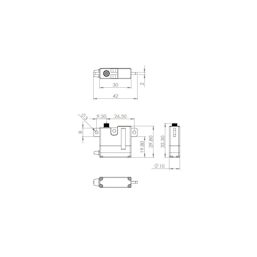 Ultra silné a rychlé tenké digitální mikroservo 22,5g s kovovými převody s napájecím napětím 6,0–8,4V, 3xBB+2. Ideální do křídel pro větroně a motorové modely. Tah 6,0kg.cm, rychlost 0,14s/60° při 6,0V, tah 7,6kg.cm, rychlost 0,11s/60° při 7,4V, tah 8,1kg.cm, rychlost 0,10s/60° při 8,2V. Rozměry 30x10x29,8mm, hmotnost 22,5g. Hliníková krabička pro dokonalé chlazení s patkami pro montáž na plocho. Programovatelné DSP-2 programátorem.