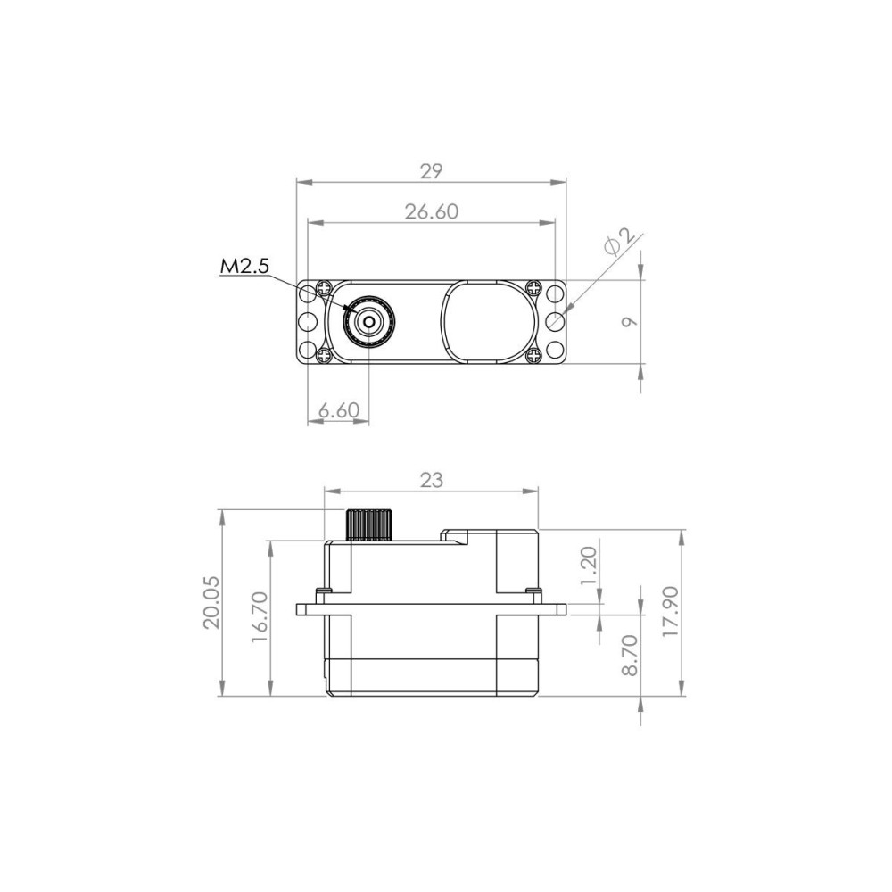 Velmi silné a rychlé tenké digitální mikroservo 7,5g s kovovými převody se širokým rozsahem napájecího napětí 3,7-8,4V (1-2S LiPo), 1xBB. Ideální pro RC házedla F3K, malé větroně a motorové modely. Tah 1,4kg.cm, rychlost 0,21s/60° při 3,7V, tah 2,3kg.cm, rychlost 0,13s/60° při 6,0V, tah 2,8kg.cm, rychlost 0,10s/60° při 7,4V, tah 3,3kg.cm, rychlost 0,09s/60° při 8,2V. Rozměry 23x9x16,7mm, hmotnost 7,5g. Hliníková krabička pro dokonalé chlazení s patkami pro montáž na plocho. Programovatelné DSP-2 programátorem.