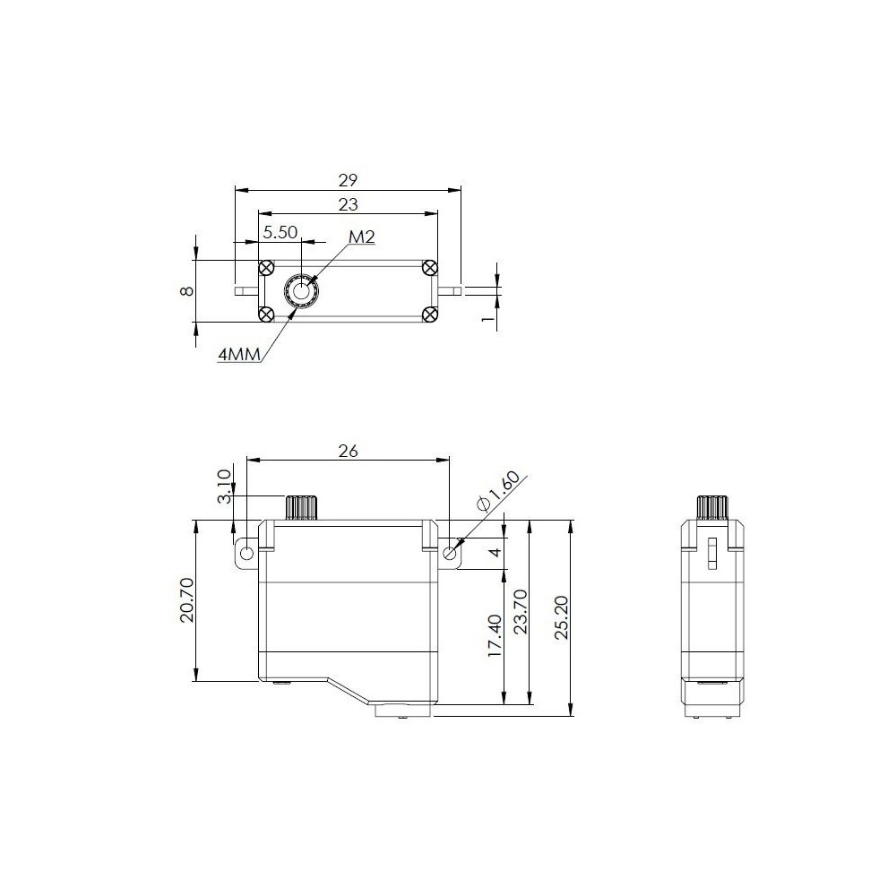 Super silné a rychlé tenké digitální mikroservo 11g s kovovými převody se širokým rozsahem napájecího napětí 3,5-8,4V (1-2S LiPo), 2xBB. Ideální do křídel pro RC házedla, větroně a menší motorové modely. Tah 2,54kg.cm, rychlost 0,18s/60° při 3,7V, tah 3,3kg.cm rychlost 0,139s/60° při 4,8V, tah 4,1kg.cm, rychlost 0,110s/60° při 6,0V, tah 5,0kg.cm, rychlost 0,089s/60° při 7,4V, tah 5,4kg.cm, rychlost 0,080s/60° při 8,2V. Rozměry 23x8x25,2mm, hmotnost 11g. Hliníková krabička pro dokonalé chlazení s patkami pro montáž na plocho. Programovatelné DSP-2 programátorem.