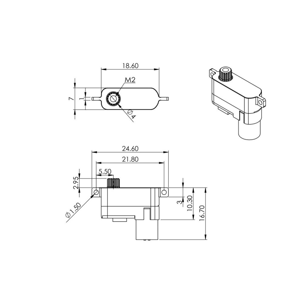 Velmi silné a velmi rychlé tenké digitální mikroservo 5,4g s kovovými převody se širokým rozsahem napájecího napětí 3,7-8,4V (1-2S LiPo), 1xkluzné ložisko. Ideální pro RC házedla, malé větroně a motorové modely. Tah 1,5kg.cm, rychlost 0,125s/60° při 3,7V, tah 2,0kg.cm, rychlost 0,110s/60° při 4,8V, tah 2,6kg.cm, rychlost 0,085s/60° při 6,0V, tah 2,9kg.cm, rychlost 0,068s/60° při 7,4V, tah 3,1kg.cm, rychlost 0,060s/60° při 8,2V. Rozměry 18,6x7x16,7mm, hmotnost 5,4g. Hliníková krabička pro dokonalé chlazení s patkami pro montáž na plocho. Programovatelné DSP-2 programátorem.