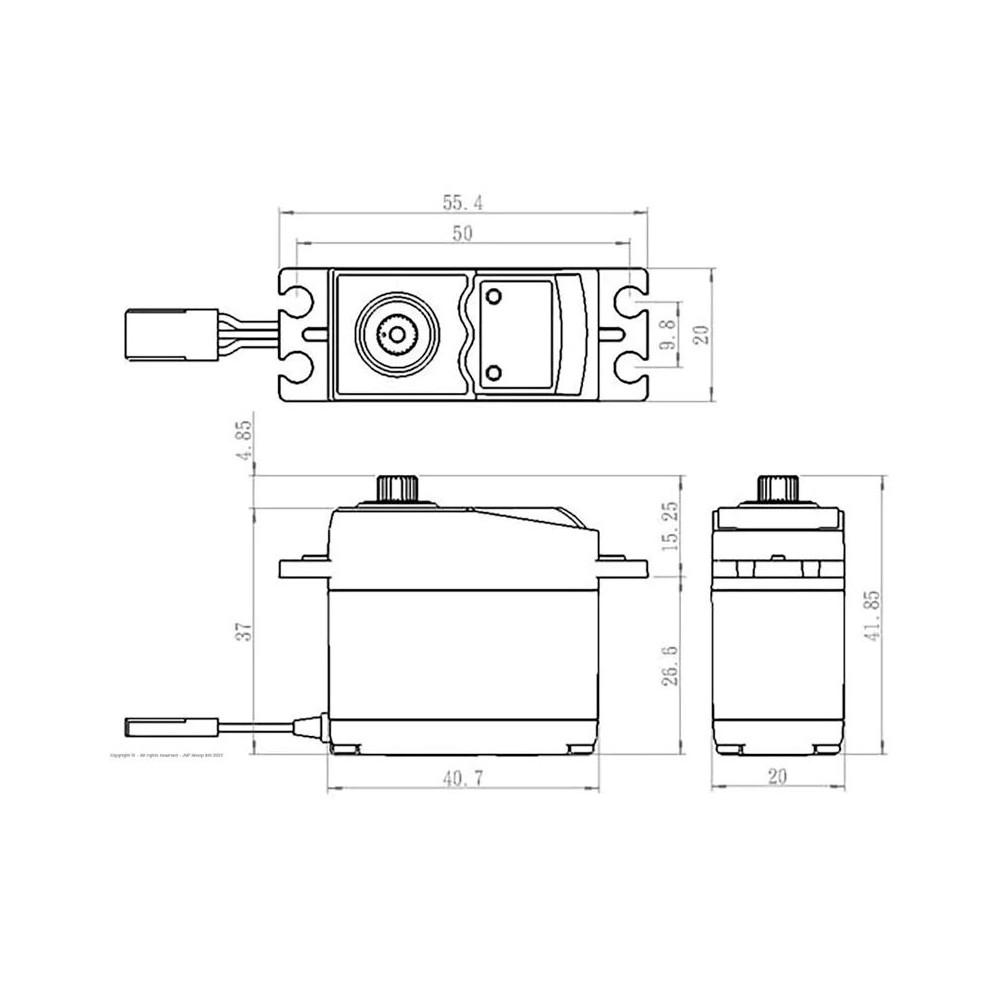 Digitální standard servo s stejnosměrným motorem a plastovými převody, 1x kuličkové ložisko, 3,2/4.1kg při 4,8/6,0V a 0,22/0,17s na 4,8/6,0V, váha 41,0g, 40,7x20,0x37,0mm. Provozní napětí 4,8 - 6,0V.