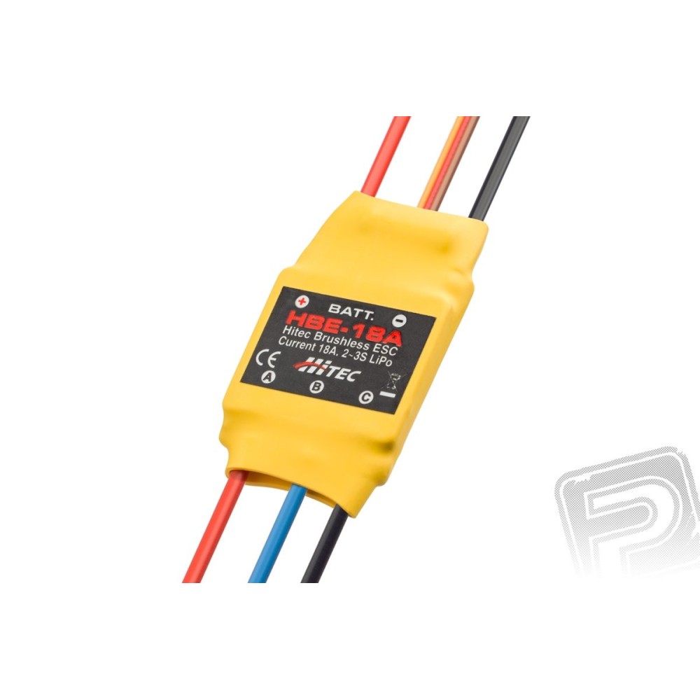 HBE-18A je střídavý elektronický regulátor otáček 18 A pro napájení z 2-3 S LiPo akumulátoru s vestavěným stabilizátorem napájení BEC 5 V/2A. Délka napájecích a motorových kabelů regulátoru je speciálně přizpůsobena pro instalaci v modelech s tlačným motorem na pylonu, jako jsou Hitec SkyScout a Multiplex EasyStar II, ale můžete jej stejně dobře použít i v modelech s motorem umístěným klasicky v přídi.