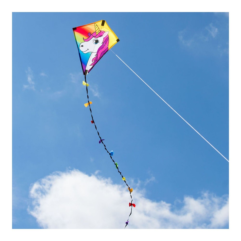 Létající drak pro děti Sleddy Unicorn. Lze jej zavěsit třeba na pásek nebo se vejde i do kapsy.