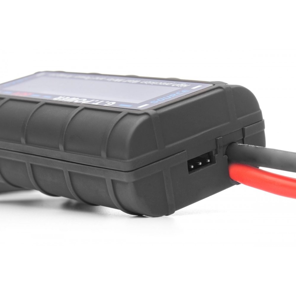 Napájecí zdroj (např. pohonný akumulátor) se připojuje ke vstupním kabelům wattmetru. Spotřebič/zátěž (např. regulátor otáček s motorem) se připojuje výstupním kabelům wattmetru. Je-li napětí měřeného zdroje nižší než 4,8 V, je třeba zajistit napájení elektroniky wattmetru připojením zdroje s napětím 4,8-6,0 V do zásuvky na levém boku (např. přijímačového akumulátoru NiMH 4,8 V).