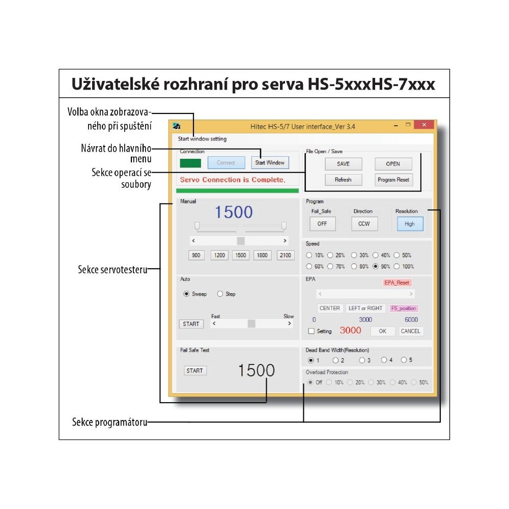 Servo je při programování/testování napájeno z přijímačového akumulátoru 4,8-7,4 V (4-6čl. NiMH, 2S LiPo/LiFe/Li-ion) zapojeného do DPC-11. Všechny parametry se nejprve nastaví v okně na obrazovce a následně nahrají do vašeho serva. Poté použijte PC a funkci servotesteru pro zkontrolování správnosti nastavení serva.