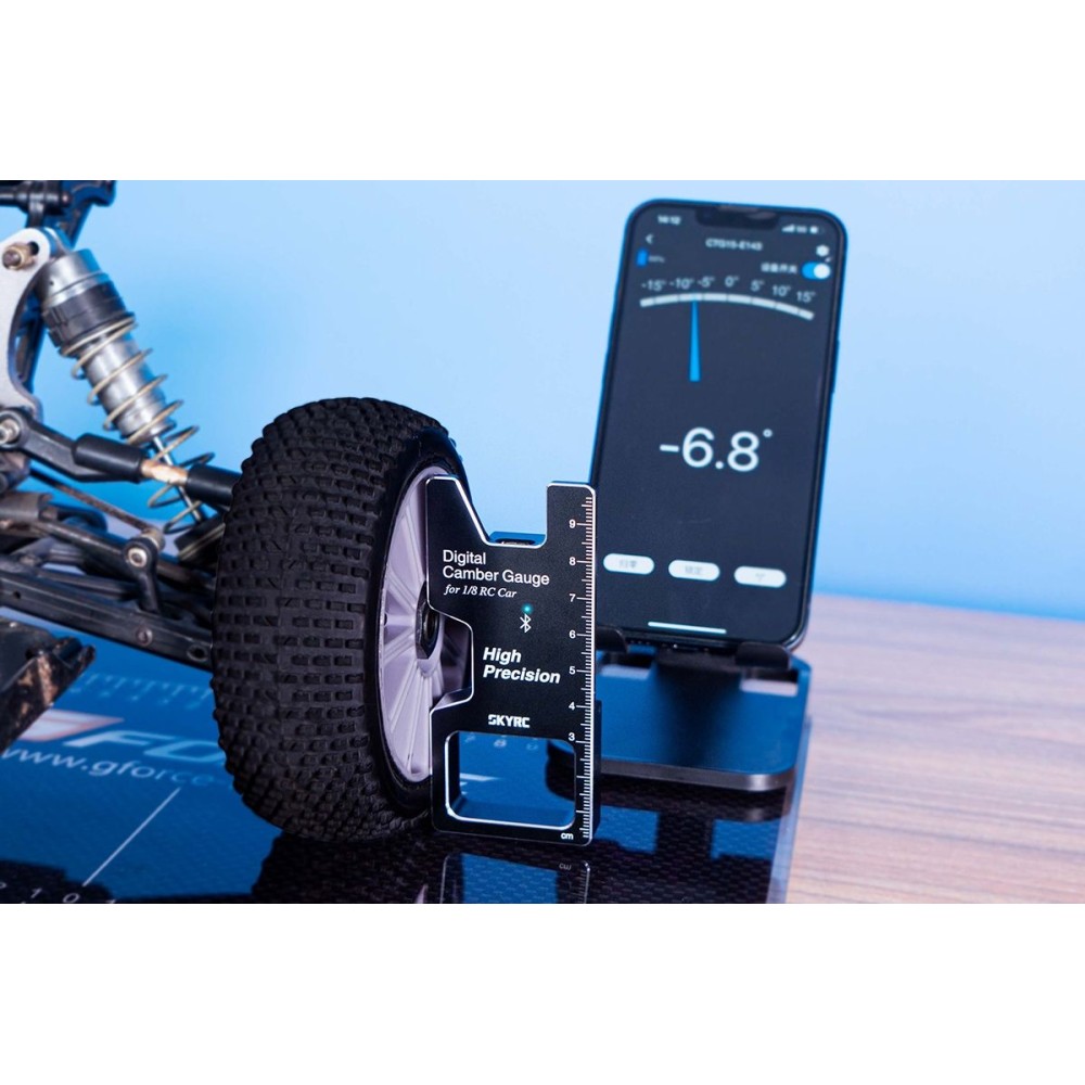 Digitální sklonoměr CTG-016 SkyRC je zařízení pro měření úhlů na kolech a nápravách modelů RC aut v měřítku 1:8. Velmi jednoduše, s vysokou přesností a rozlišením dokáže měřit příčný sklon kol, sbíhavost/rozbíhavost apod. S aplikaci RC Gears na smartphonu připojeném pomocí Bluetooth potom můžete úhly měřit a zobrazovat v grafické i digitální podobě.