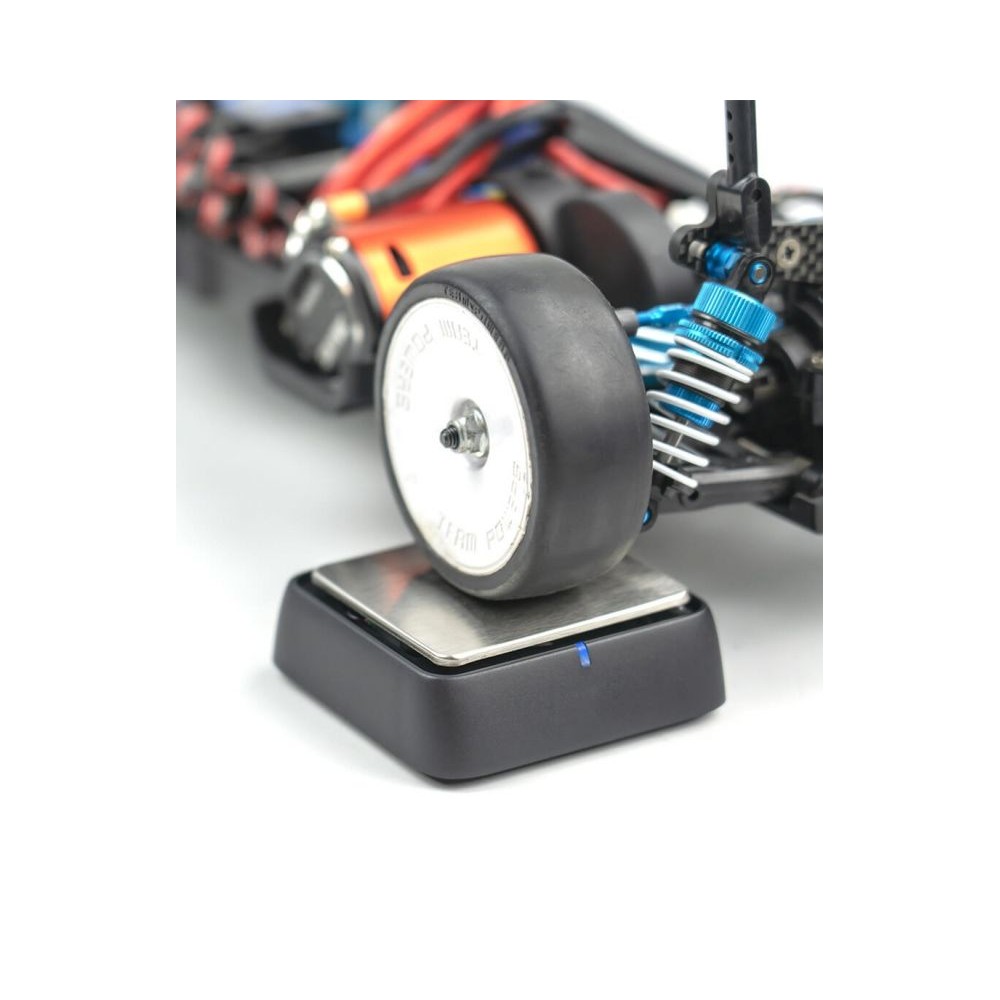 Digitální elektronická váha pro vyvažování podvozků RC aut 1:12-1:8 s max. zatížením jednoho kola 2kg, rozlišení 0,1g. Zobrazuje zatížení jednotlivých kol a náprav, diagonální zatížení, celkovou hmotnost, percentuální rozdělení zatížení. Váha je ovládána přes mobilní aplikaci RCGears (iOS/Android).