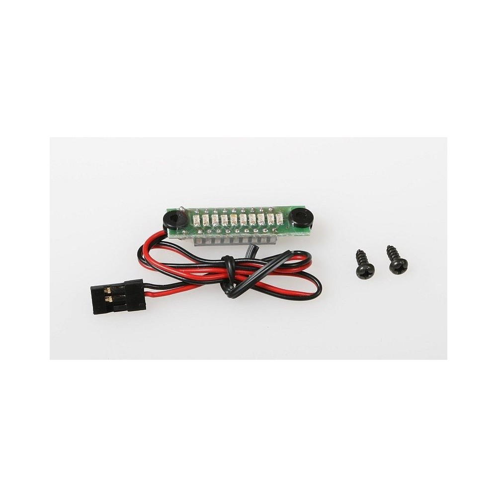 Sloupcový indikátor napětí ("běžící bod") pro Ni-XX akumulátorové sady se 4 články s 10 LED. Indikátor se napájí z měřeného akumulátoru, je vybaven patkami s gumovými průchodkami pro přišroubování na vhodné místo modelu.