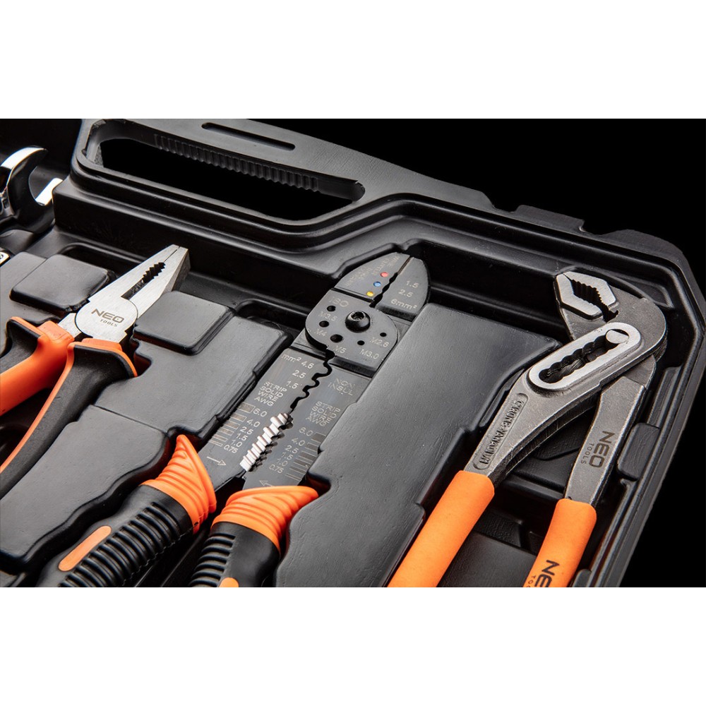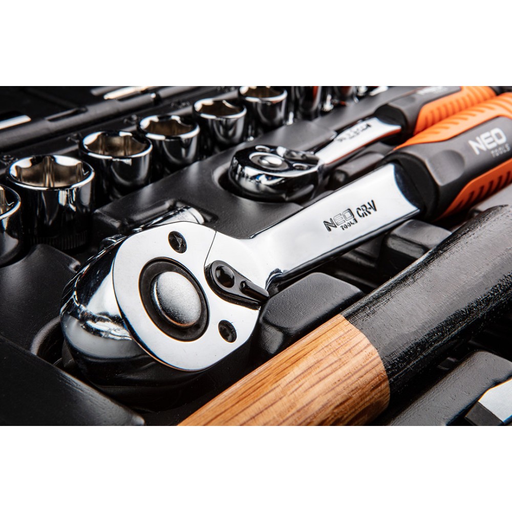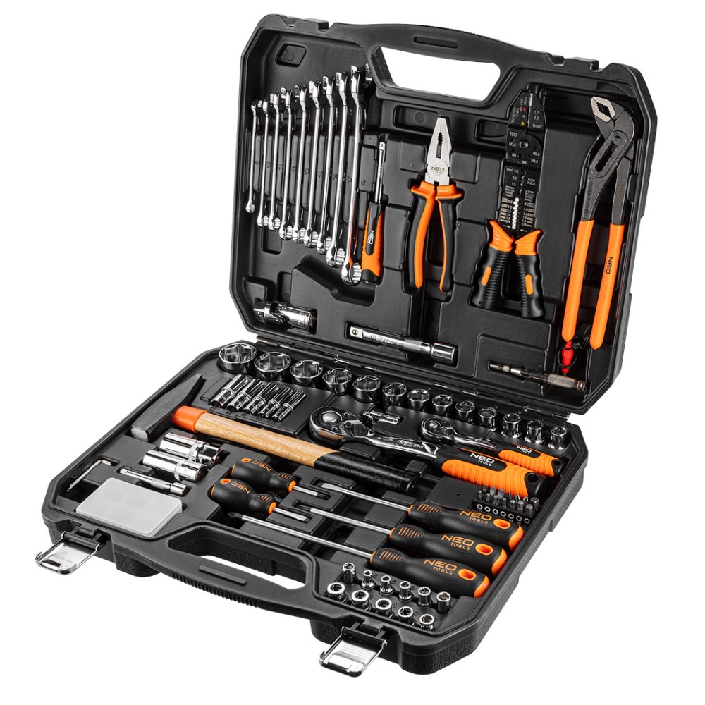 Sada nářadí NEO (ref. 08-920) obsahuje 100 položek. Nástroje jsou k dispozici ve dvou velikostech: 1/2" a 1/4". Nástrčné hlavice, ráčny a klíče jsou vyrobeny z vysoce pevné chrom-vanadiové oceli a šroubovací bity z nástrojové oceli S2. Sada obsahuje kladivo, univerzální a trubkové kleště, krimpovací kleště, zkoušečku, šroubováky (plochý a křížový). Dále ráčnu, prodlužovací nástavec a kloub. Doplňkové nástrčné hlavice 1/2" (ve velikostech od 10 do 32 mm) a 1/4" nástrčné hlavice. (v rozměrech od 4 do 13 mm), zásuvky pro zapalovací svíčky 16 a 21 mm. Sada otevřených klíčů 8-19 mm výrazně rozšiřuje možnosti použití této sady. Sada šroubovacích bitů (křížový, plochý, Torx a šestihranný) s 1/4" adaptérem, 1/4" šroubovacím bitem a 3 šestihrannými klíči 1,5, 2 a 2,5 mm je dokonalým doplňkem. Celek je uložen v řádně vybaveném a robustním kufříku s kovovými sponami.